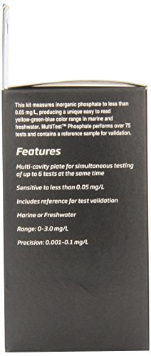 This kit measures inorganic phosphate to less than 0.05 mg/L, producing a unique easy to read yellow-green-blue color range in marine and freshwater. MultiTest? Phosphate performs over 75 tests and contains a reference sample for validation. Range: 0?3.0 mg/L. Precision: 0.001?0.1 mg/L.