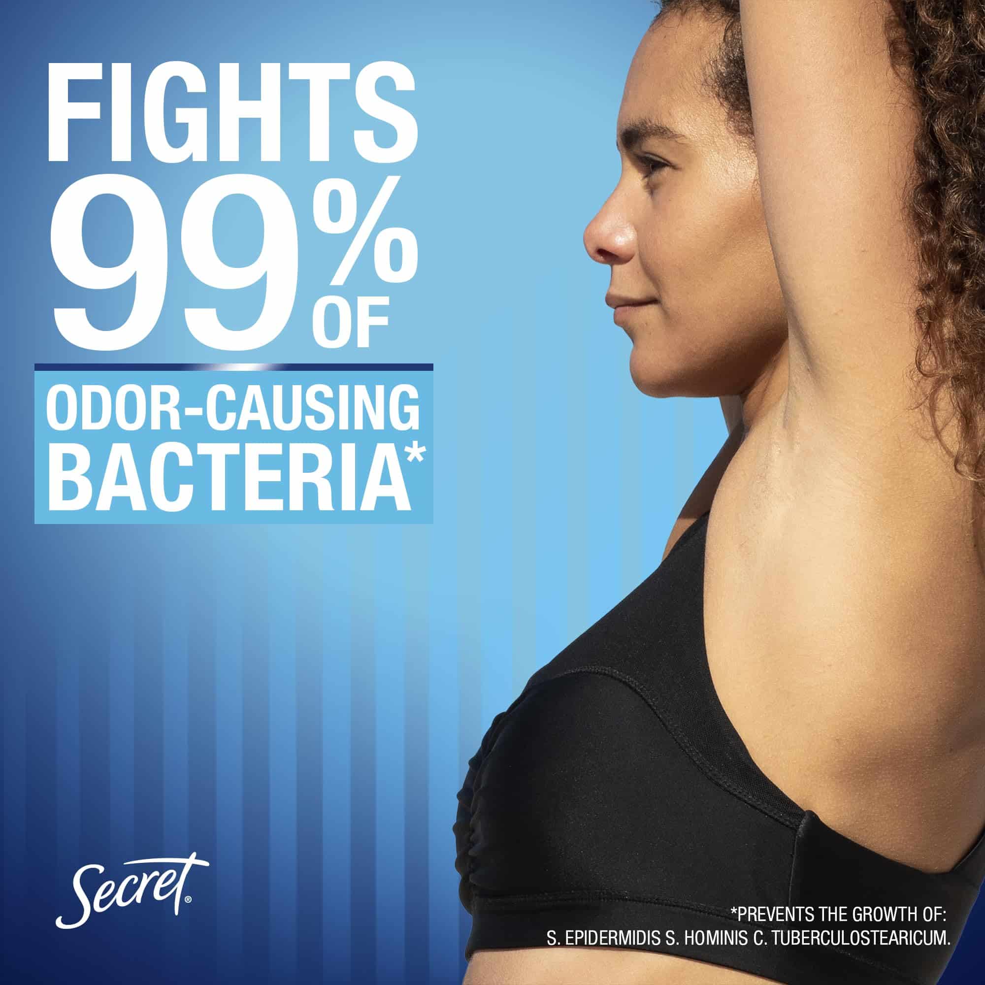 4-IN-1: 1) 48HR SWEAT & ODOR PROTECTION, 2)FIGHTS ODOR-CAUSING BACTERIA, 3) GOES ON CLEAR, 4)GENTLE ON SKIN. Sweat is the last thing you need to be worried about. Take one worry off of your plate first thing in the morning. When you use Secret, you’re getting the peace of mind that your deodorant will work as hard as you do.