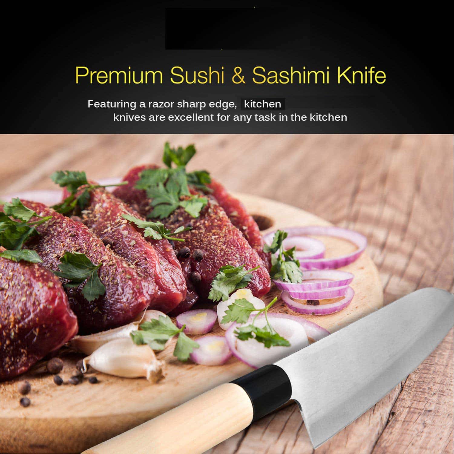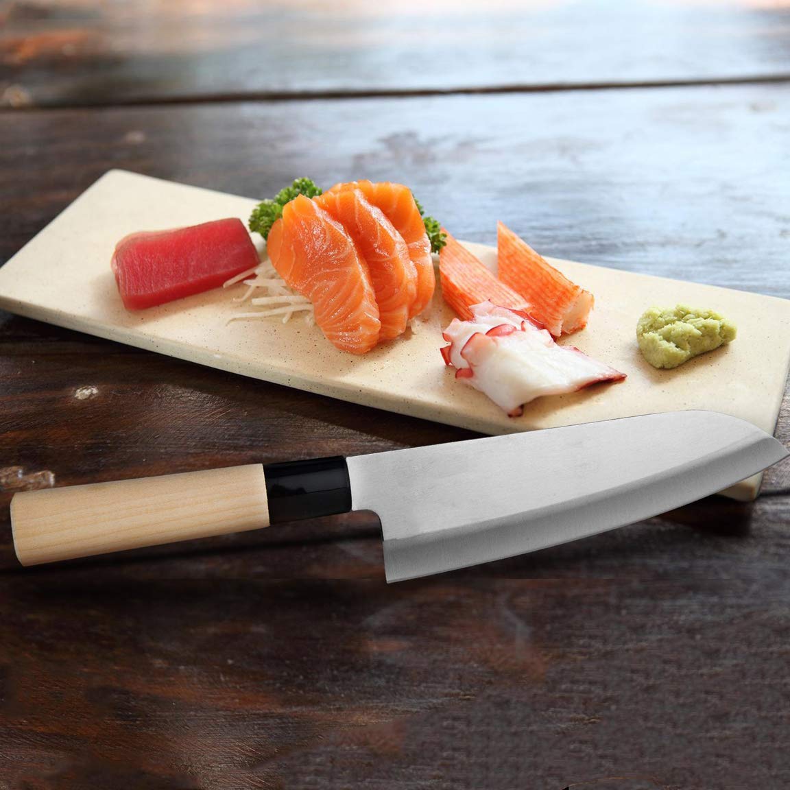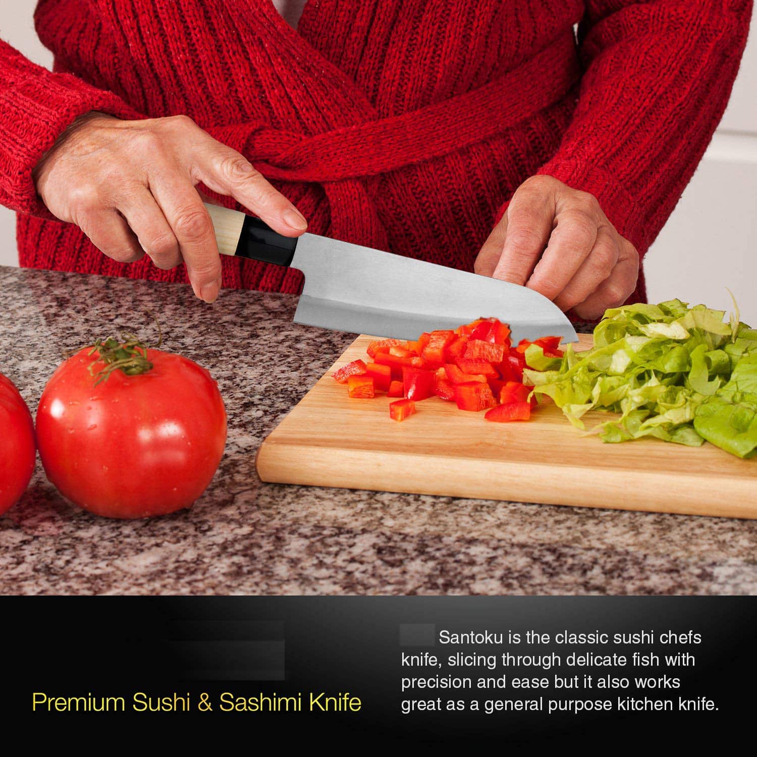 All purpose japanese santoku knife for vegetable, fish and meat. * Molybdenum Rust-Resistant Steel Blade * Razor Sharp Edge * Blade Length: 6-5/8 in * Overall Length: 11-5/8 in * Wooden handle offers maximum comfort & control * Plastic Bolster * Easy to sharpen * Made in Japan by Sekiryu * How to Sharpen: * >Sharpening on a whetstone * >Dampen whetstone. * >Sharpen on whetstone on flat surfaces only * Usage & Care: * Wash Knife with dishwashing liquid before use. * always dry blade thoroughly after washing. * Do not use scrub brushes or abrasive cleansers * Types of Knives: * Santoku — All purpose: For Vegetable, Fish, Meat * Nakiri — Chopping: For Vegetable * Gyutou — Multipurpose kitchen Knife. for Cutting vegetable, fish, or Meat * Deba — Hard Foods: Fish bones, Meats * Sashimi — Slicing: Slicing raw fish