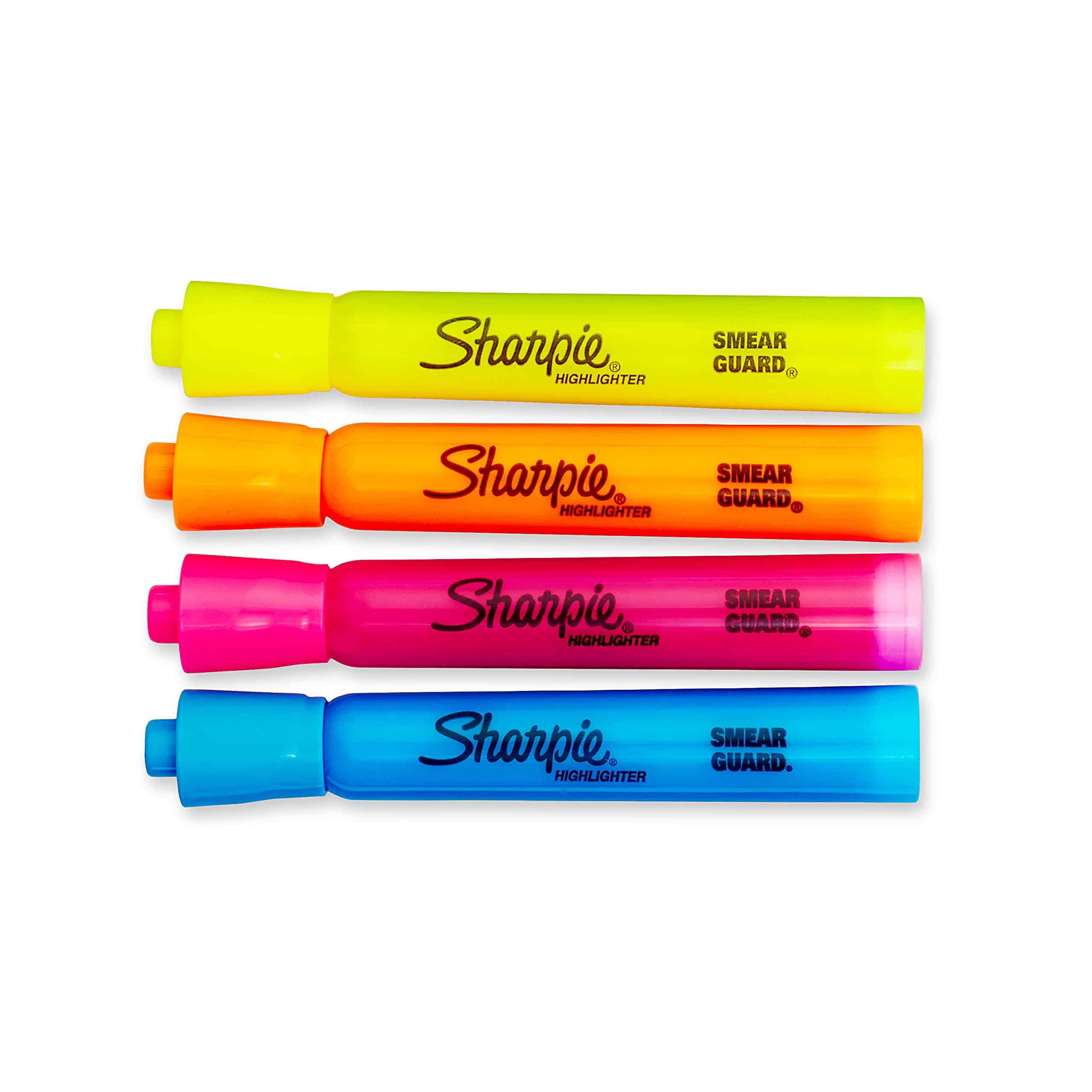 Sharpie Highlighters feature a tank style and easy gliding chisel tip for a smooth highlighting experience. The chisel tip lets you highlight both wide and narrow lines of text. Smear Guard ink is specially formulated not to smear when highlighting over many pen and inks, such as inkjet printouts, written notes, newspapers and more. Bright, see-through colors make your highlighted text easy to read. Certified AP nontoxic ink is odorless and quick-drying. Let ink dry before highlighting.