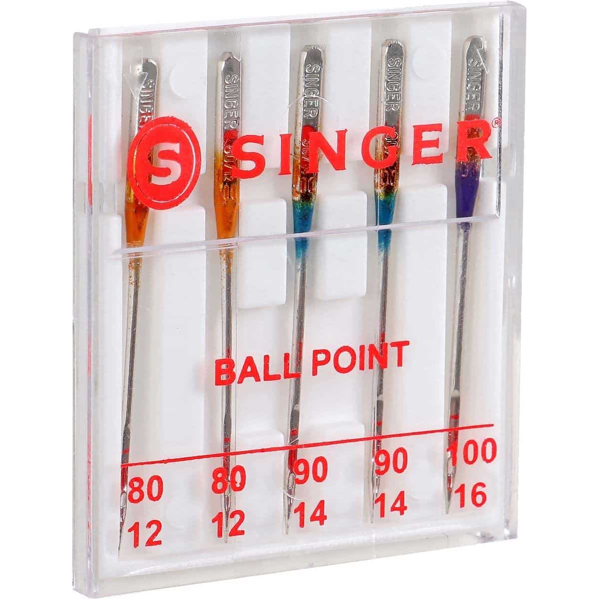 A necessary staple in any sewing enthusiast?s tool kit, this set of 5 ball point machine needles is for sewing basic stitches on knit fabrics. Ball point needles are designed to prevent skipped stitches and eliminate holes or runs in the fabric, as the ball point slides between knit fibers rather than puncturing the fabric. Assorted color-coded sizes include orange size 80/11 for use on lightweight fabrics, blue size 90/14 to use on medium weight fabrics, and purple size 100/16 to use on heavyweight fabrics. These needles can be used on SINGER, Brother, Kenmore and other quality sewing machines.