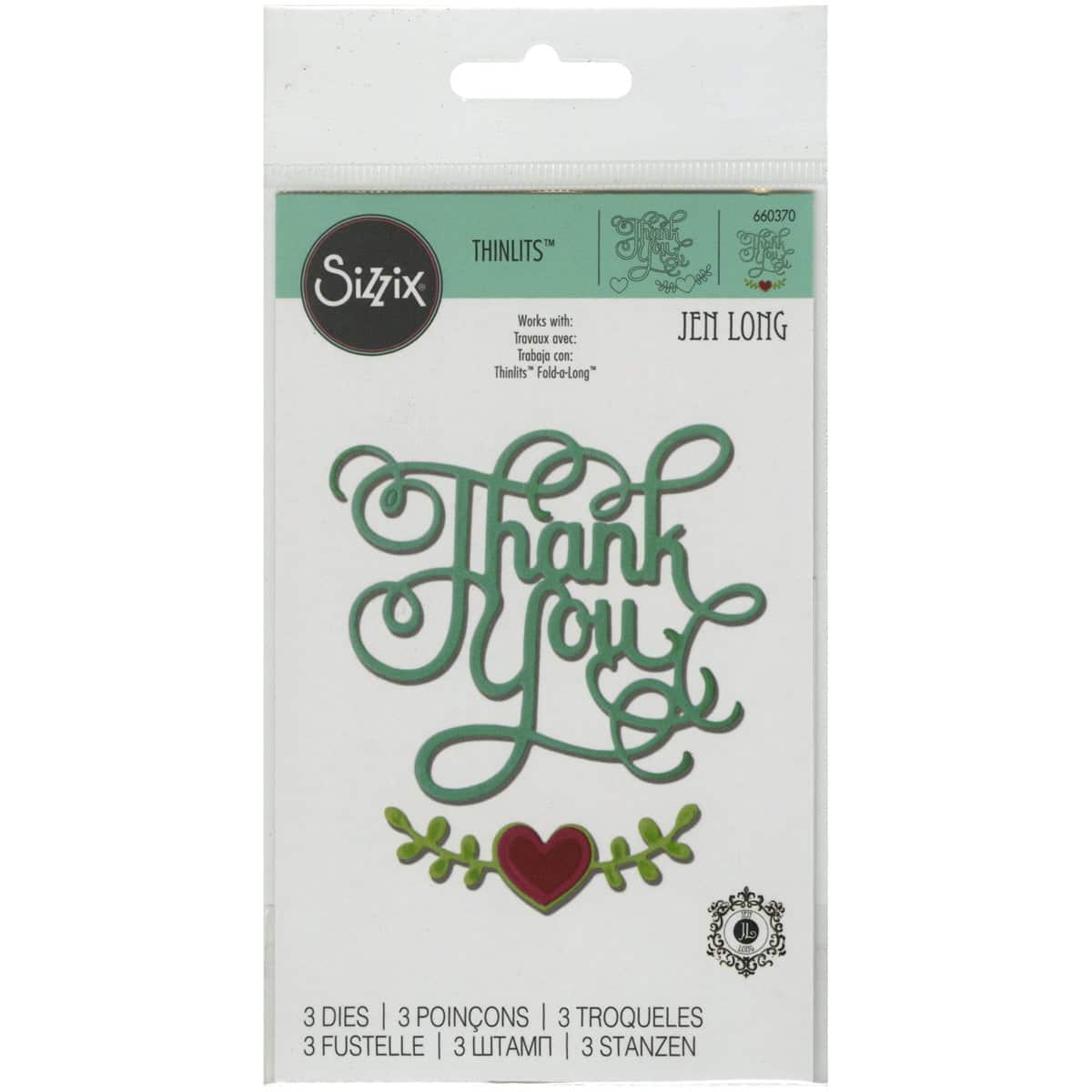 Thinlit dies offer a variety of affordable solo options or multi die options. Thinlits are easy to use and are compact and portable. These dies are compatible with Sizzix BIGkick, BigShot and Vagabond. This 6-1/2×3-3/4 inch package contains three dies. Design: Thank You With Hearts. Imported.