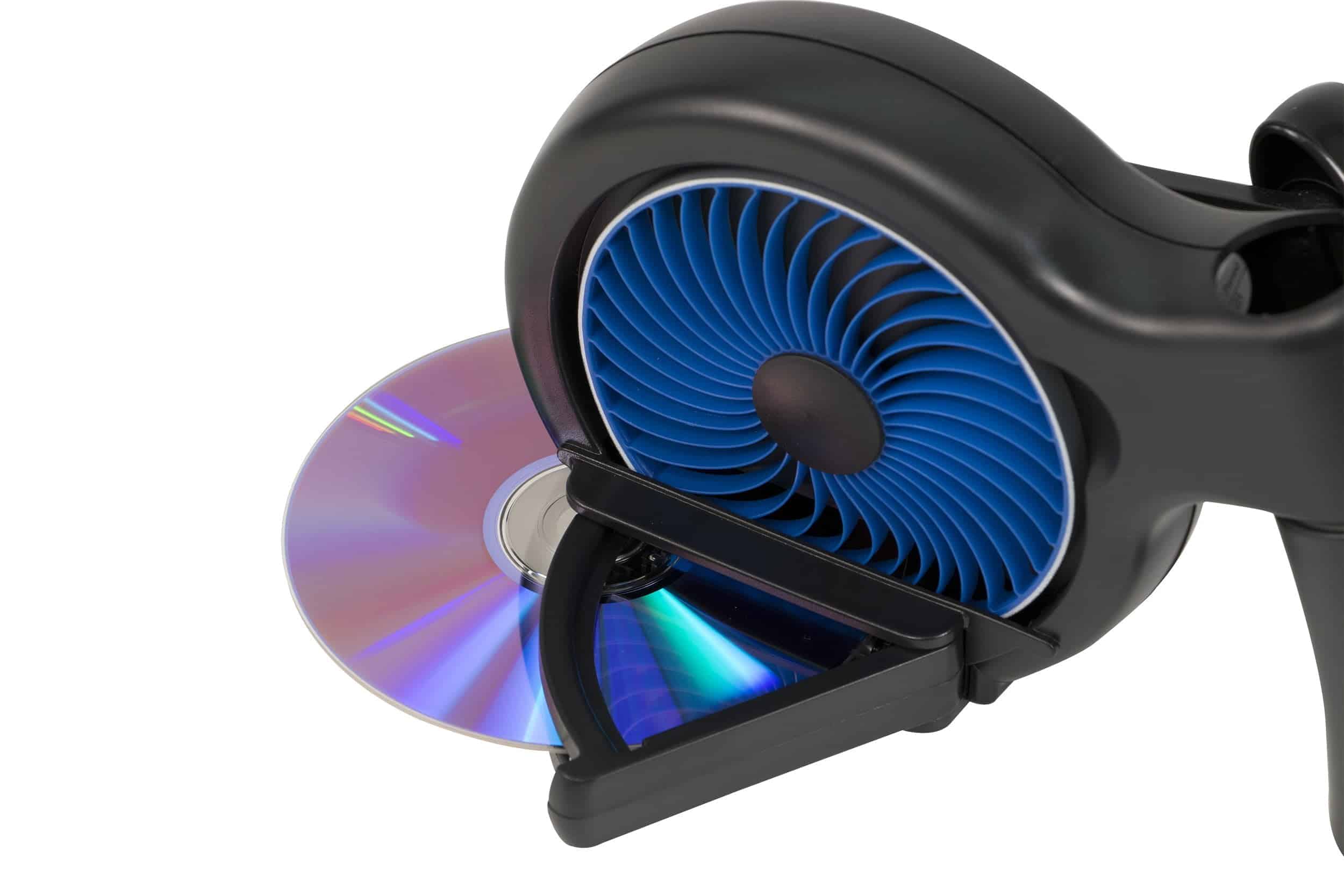 The SkipDR Classic disc repair system is a manual device that can fix minor scratches to CDs and DVDs. It can repair up to 25 discs using a patented FlexiWheel, and resurfacing fluid to smooth the surface of damaged discs. The patented FlexiWheel, with its unique microfrictional surface, uniformly repairs damaged discs without losing data. As well as handling standard optical discs, the SkipDR Classic can also repair discs for: PlayStation 1 and 2; XBOX / XBOX 360, and the Nintendo Wii. The repair kit contains: a FlexiWheel, rejuvenating fluid, and a special drying cloth and felt buffing square (Packed inside the handle of the unit).