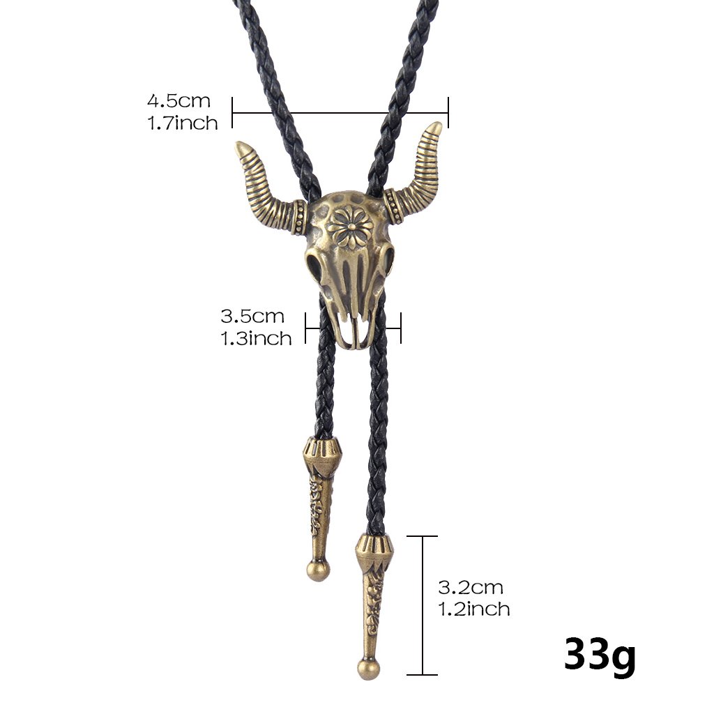 - MODERN DESIGN: Our western cowboy bolo tie leather rope length is 42.5 inches with skull adornment size 1.7 inches, with adjustable skull and leather cord connected, you can wear it as a traditional bolo tie firm to your neck for wedding or business event, and also can be your fashion bolo necklace or bolo choker with your casual dress.