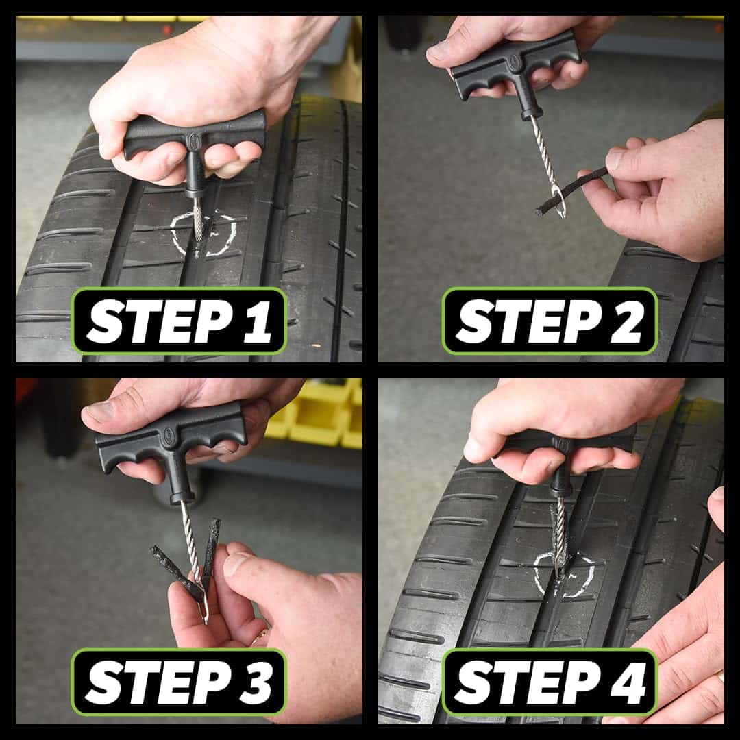 - Kit includes 6 x 4″ 7-ply long tire plug strings, T-handle reamer and T-handle plugger