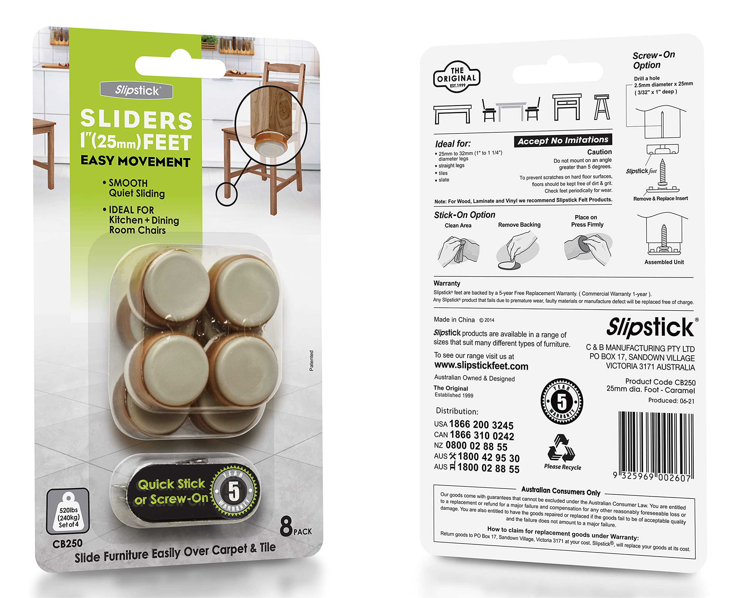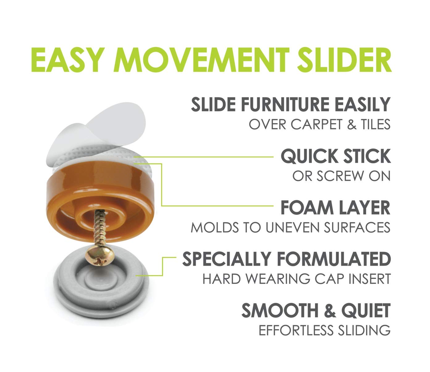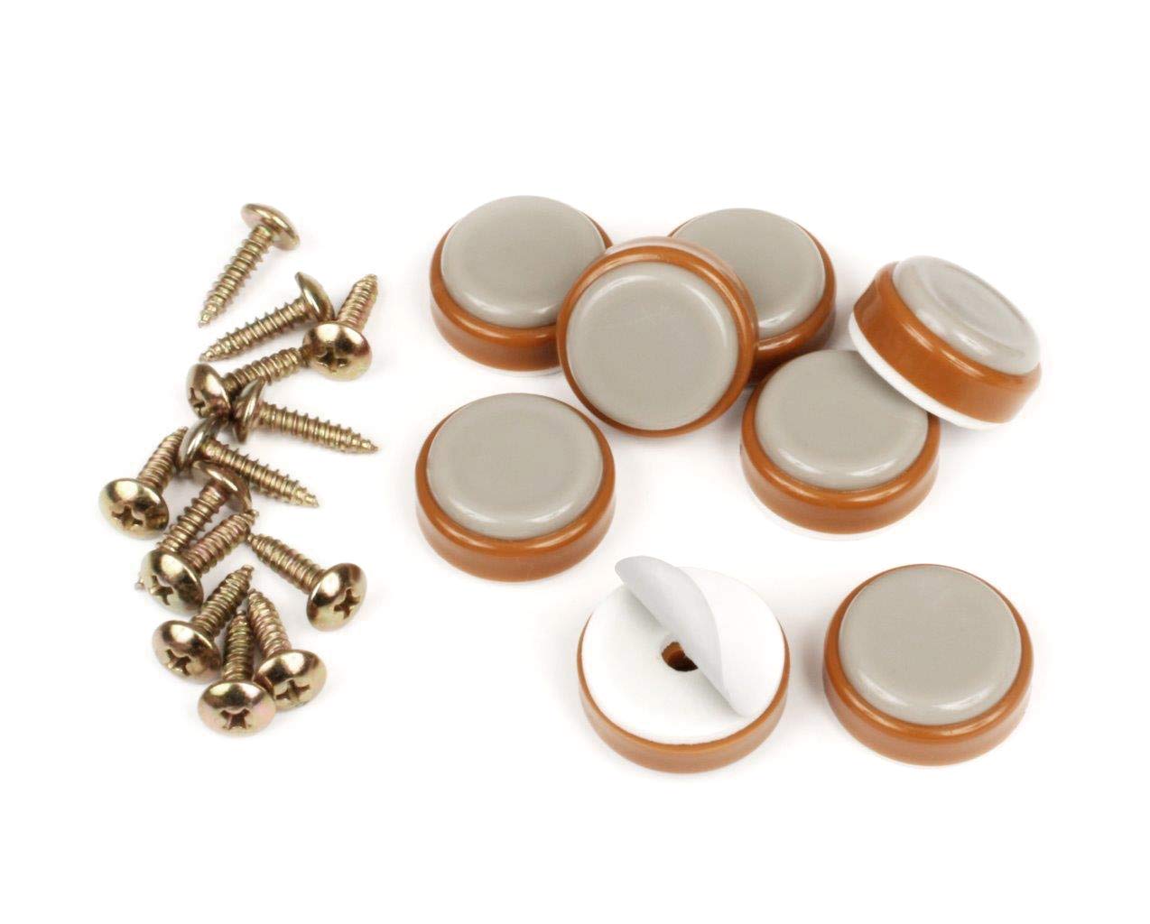 Don?t let your furniture and chair legs damage your floors. These 1-inch slider feet will keep your floors pristine for years to come quietly and smoothly. The patented slider glide features an easy to clean sliding surface and a peel-and-stick adhesive back for quick attachment, they can be installed instantly. For a more permanent attachment, screws are also included for a more enduring hold.