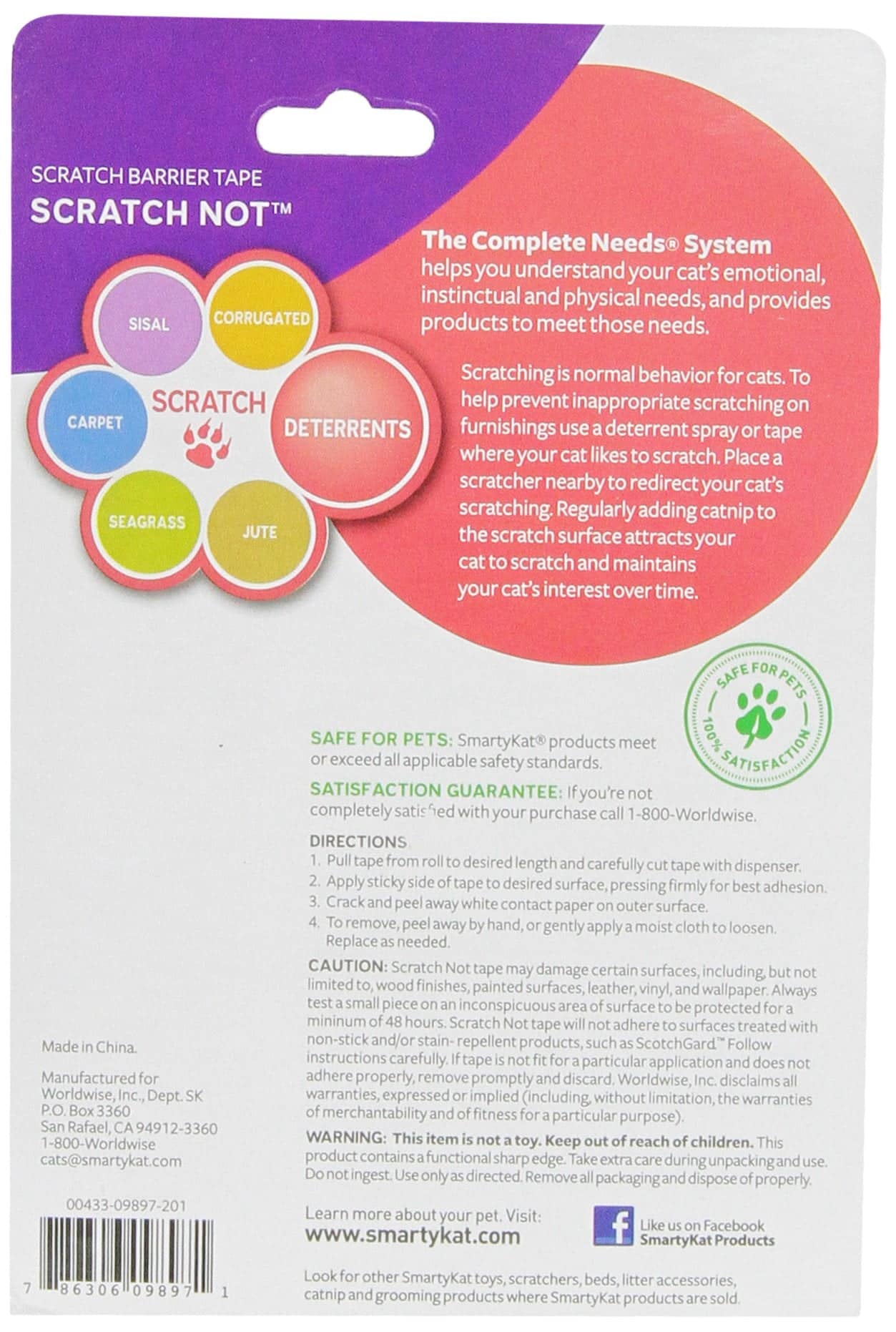 SmartyKat Scratch Not Deterrent Tape protects and directs your cat away from home furnishings. It easily rolls onto home furnishings to protect them from feline scratching. This safe and effective barrier is invisible and easy to remove from furnishings. Scratch Not tape may damage certain surfaces. Always test a small piece on an inconspicuous area of the surface to be protected for a minimum of 48 hours. SmartyKat toys, beds and scratchers are designed to meet the needs of your cat: Exercise, Hunt, Stimulation, Interaction, Scratch and Comfort without forgetting about FUN! Kids and pets often share the same space in the home and will have access to each other?s toys. That is why we design products to meet child safety standards; ensuring kids in the home are safe, whether they are two-footed or four-pawed! We utilize recycled and sustainable materials wherever possible. Please read all packaging instructions, warnings and cautions upon receipt. Packaging may contain small parts, discard after opening.