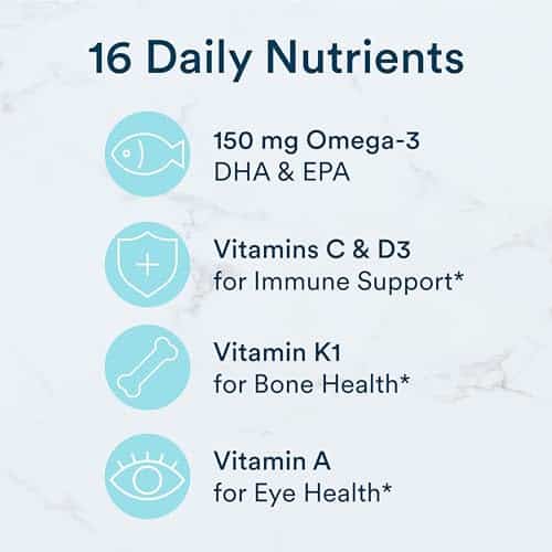 - WITH 16 NUTRIENTS TO SUPPORT WHOLE BODY HEALTH*: Our science-backed formula includes vitamins B12, A, E, K1, and iodine, as well as Omega-3 EPA & DHA, meaning you get the benefits of a daily dose of multi and omegas all in a delicious serving