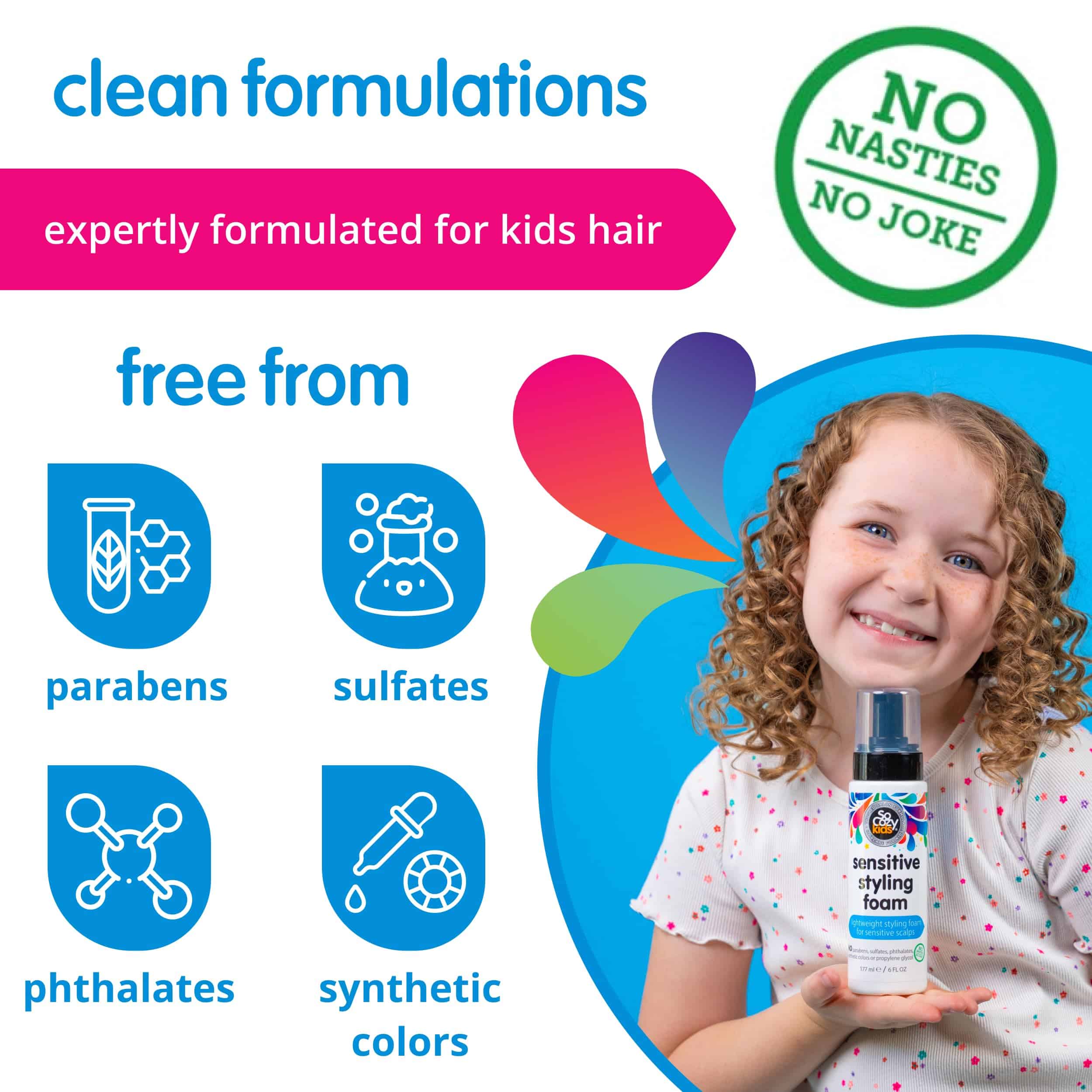 - No Nasty Ingredients: Apply our Sensitive Styling Foam for Kids with confidence; This kids curl foam is free of Parabens, Sulfates, Phthalates, Formaldehyde, Synthetic Colors or Dyes & Propylene Glycol