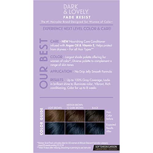 Fade-Resist Rich Conditioning Color is an innovative formula that delivers vibrant, fade-resistant color and shine. This formula contains Dark and Lovely’s exclusive Moisture Seal technology for double the conditioning power ?especially designed to help protect relaxed and natural hair while coloring. The result is silky, shiny hair and luxurious, rich color that lasts up to 8 weeks Packaging May Vary. What you receive may not be what is reflected on site. #1 haircolor brand designed for women of color *?Nielsen ScanTrack unit sales data for US women of African descent haircolor category Latest 52 weeks ending 11.09.19?
