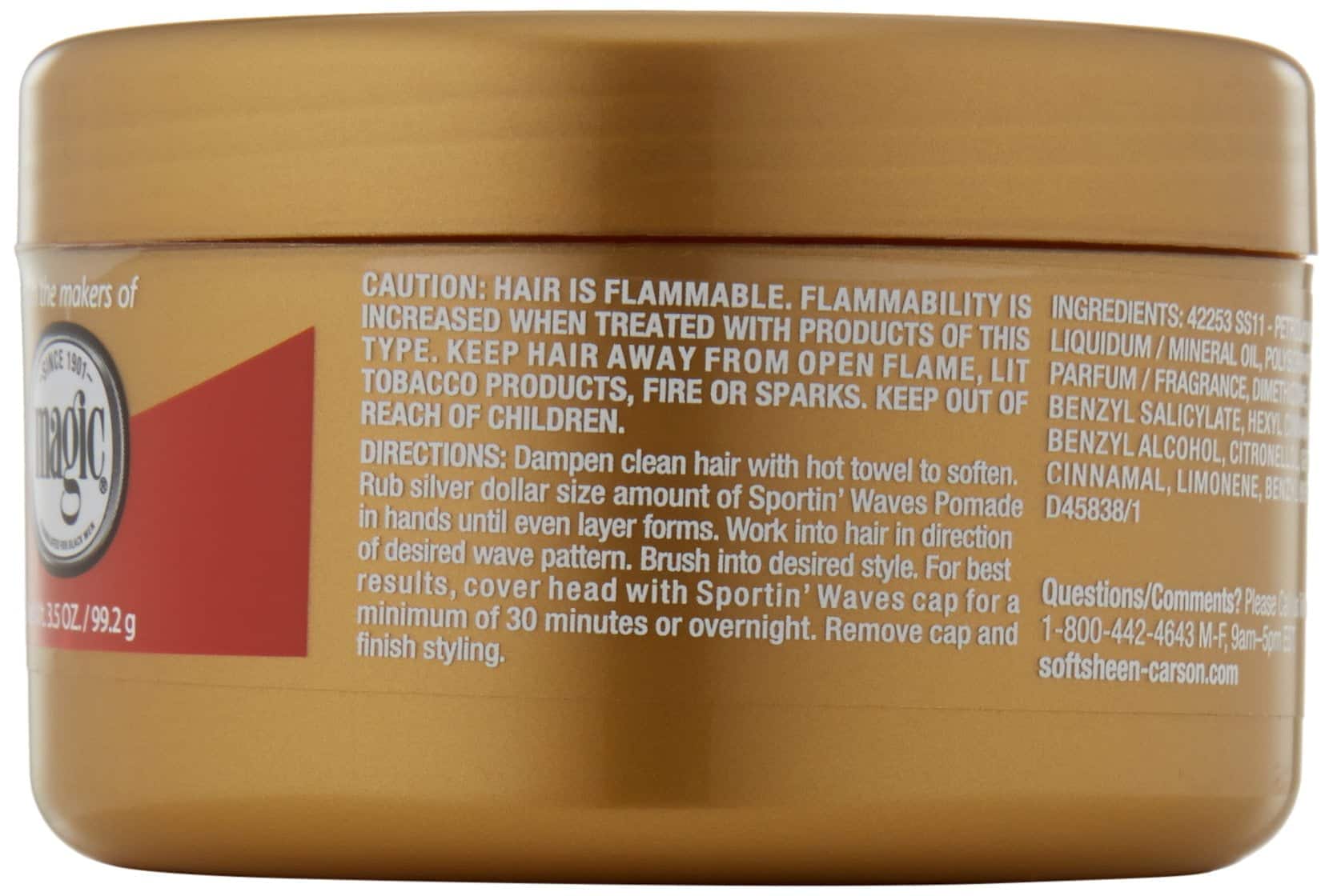 Maintenance hair styling product, with natural sheen and hold for short and brushable hairstyles. Promotes waves and restores moisture. Goes on easy and rinses out clean. Maximum hold strength. ? Maximum wavemaking formula ? Rinses out clean ? Maximum hold ? We believe in beauty without compromise Dampen clean hair with hot towel to soften. Rub silver dollar sized amount of pomade in hands until even layer forms. Work into hair in direction of desired wave pattern. Brush into desired style. HAIR IS FLAMMABLE. FLAMMABILITY IS INCREASED WHEN TREATED WITH PRODUCTS OF THIS TYPE. KEEP HAIR AWAY FROM OPEN FLAME, LIT TOBACCO PRODUCTS, FIRE OR SPARKS. KEEP OUT OF REACH OF CHILDREN.