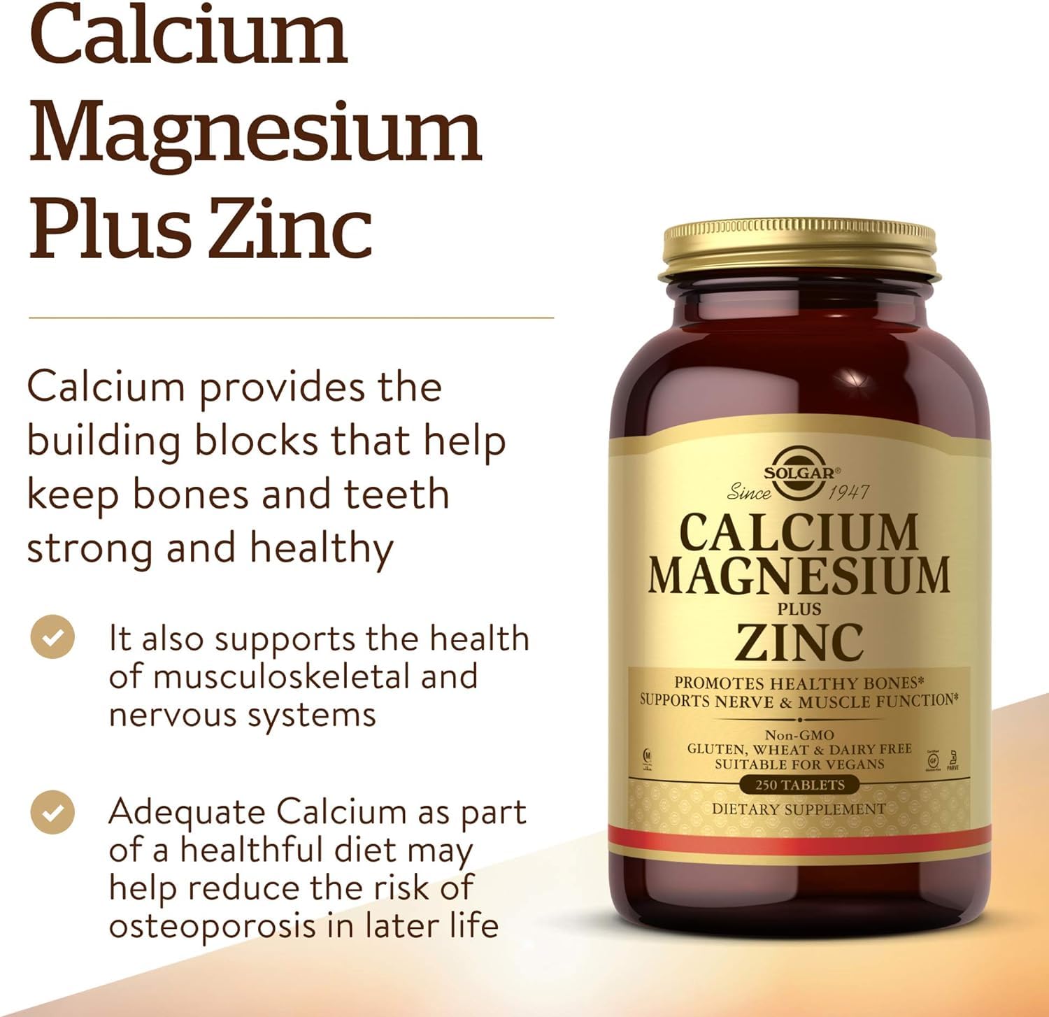 Solgar Calcium Magnesium Plus Zinc, 250 Tablets – Promotes Healthy Bones and Teeth – Supports Nerve & Muscle Function – Non GMO, Vegan, Gluten Free, Dairy Free, Kosher, Halal – 83 Servings