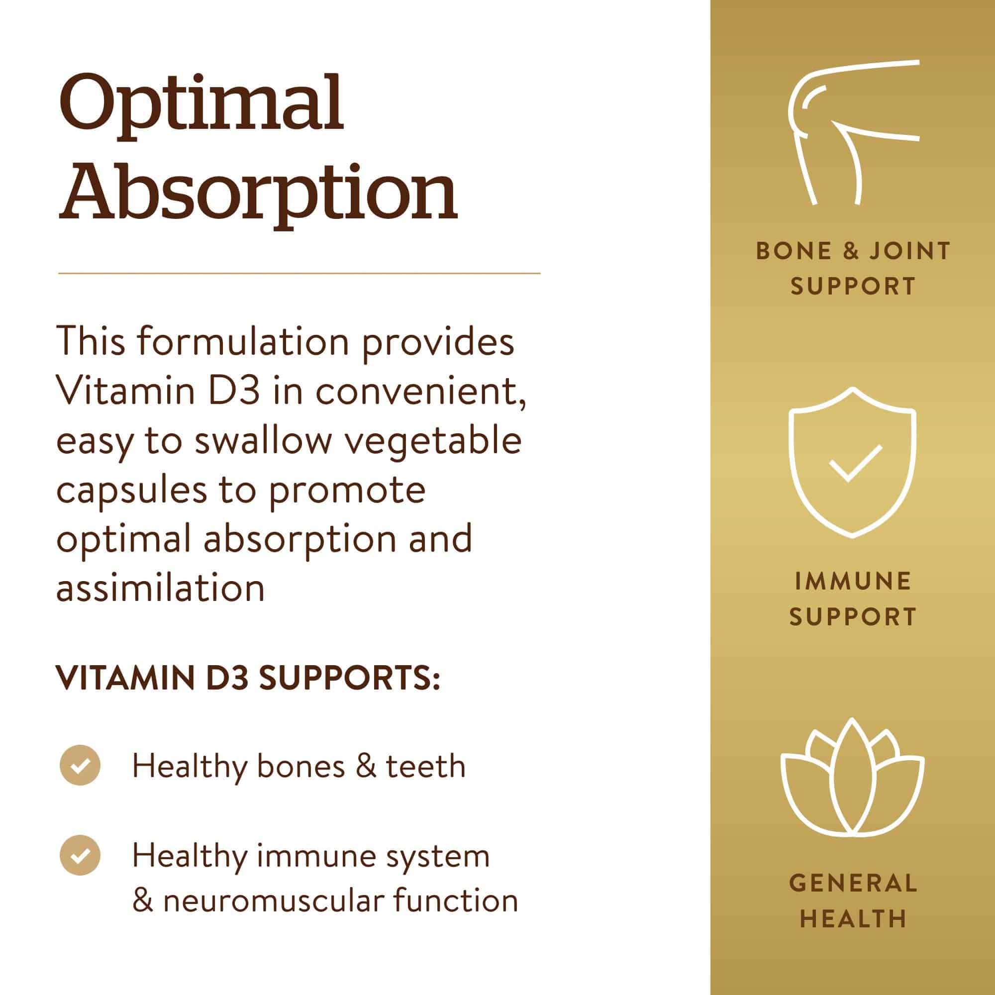 • Maintain Healthy Bones & Teeth; Vitamin D is required to promote calcium absorption, which helps maintain healthy bones and teeth; Solgar Vitamin D3 Vegetable Capsules provide 125 mcg (5000 IU) in one easy to take veggie capsule