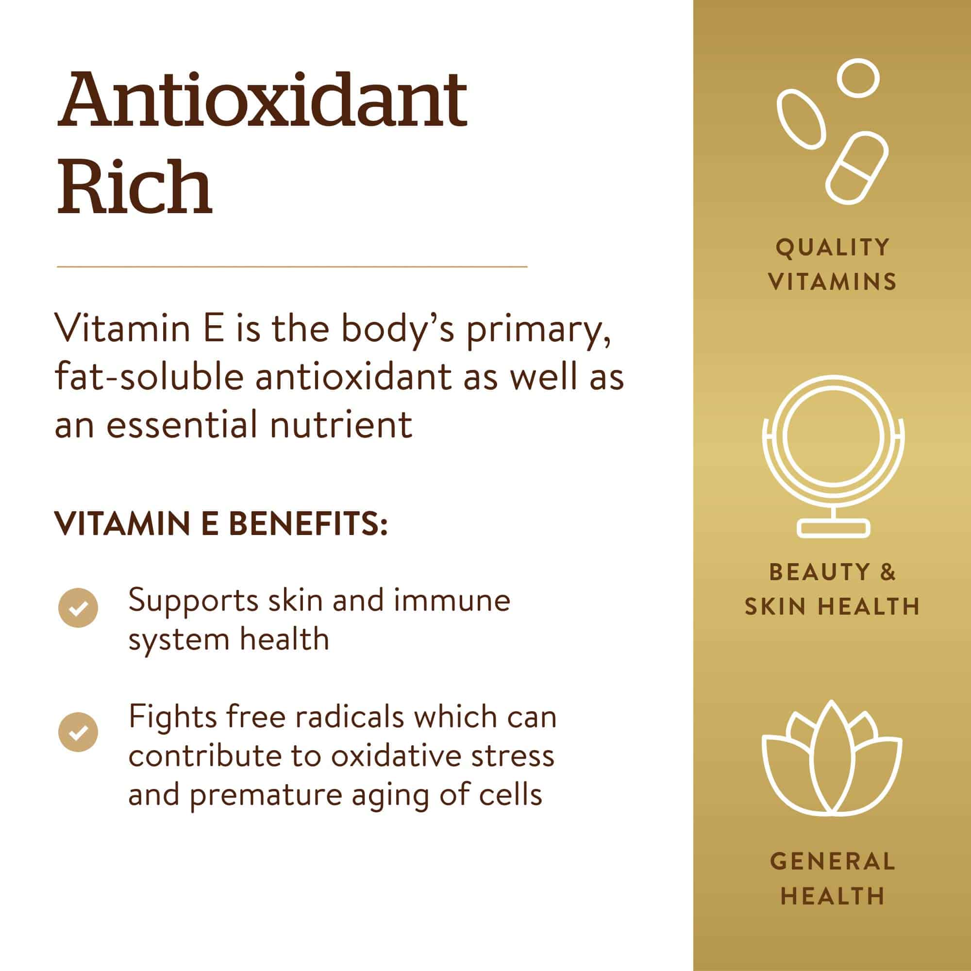 - Powerful Antioxidant; Vitamin E is the body’s primary, fat-soluble antioxidant; As an antioxidant, it helps fight cell-damaging free radicals; Free radicals can cause oxidative stress in the body, which may contribute to the premature aging of cells