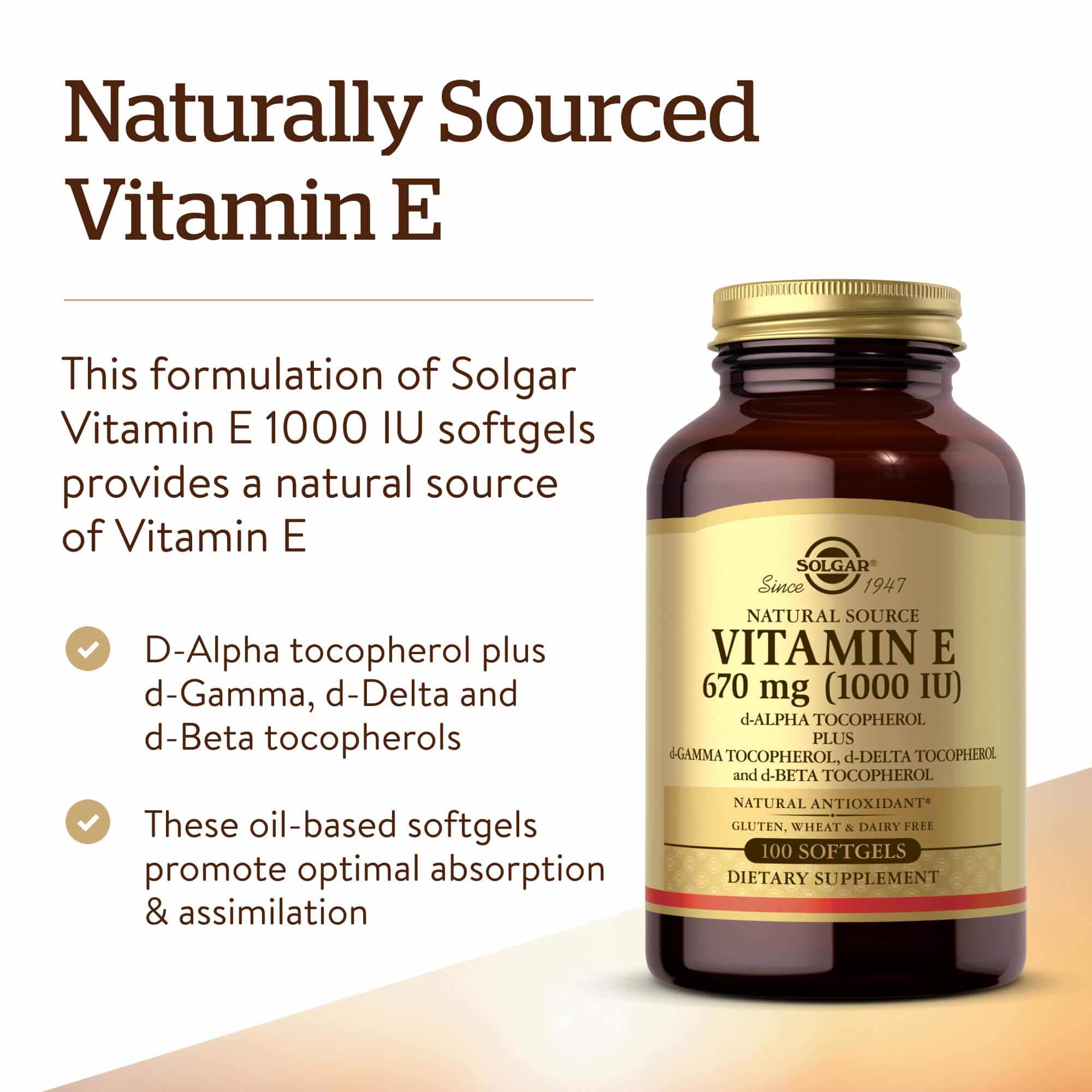 - Optimal Absorption; This formulation provides Vitamin E (as d-Alpha Tocopherol) and d-Gamma, d-Delta, and d-Beta Tocopherols; It is offered in oil-based softgels to support optimal absorption and assimilation