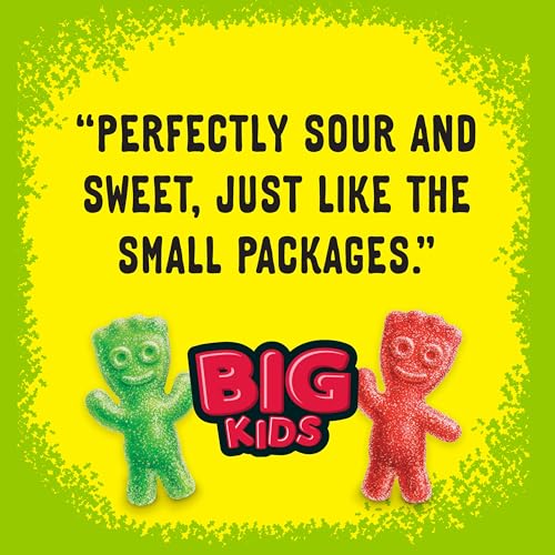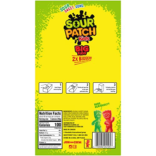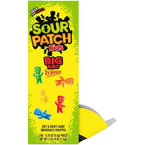 SOUR PATCH KIDS Big Individually Wrapped Soft & Chewy Candy doubles up on fun and flavor. This delicious SOUR THEN SWEET candy comes in assorted fruit flavors to delight your taste buds. Plus, this candy comes in fun colors, like red candy and green candy, to match the fruity flavors. The large kid-shaped chewy snacks are two times bigger than the original for even more of a SOUR THEN SWEET candy experience. A fat free food, this fruit flavored candy makes a great sour treat for multiple occasions. Enjoy this candy whenever you want a SOUR THEN SWEET treat by keeping a package on-hand for quick snacks or as party favors for Halloween, Valentine’s Day or birthdays. SOUR PATCH KIDS sour candies also make great movie theater candy to snack on during your favorite flick. Each soft candy is sealed in plastic packaging to ensure it stays soft, chewy and fresh until you bite into it. Stay stocked with bulk candy so you’re always ready for a snack.