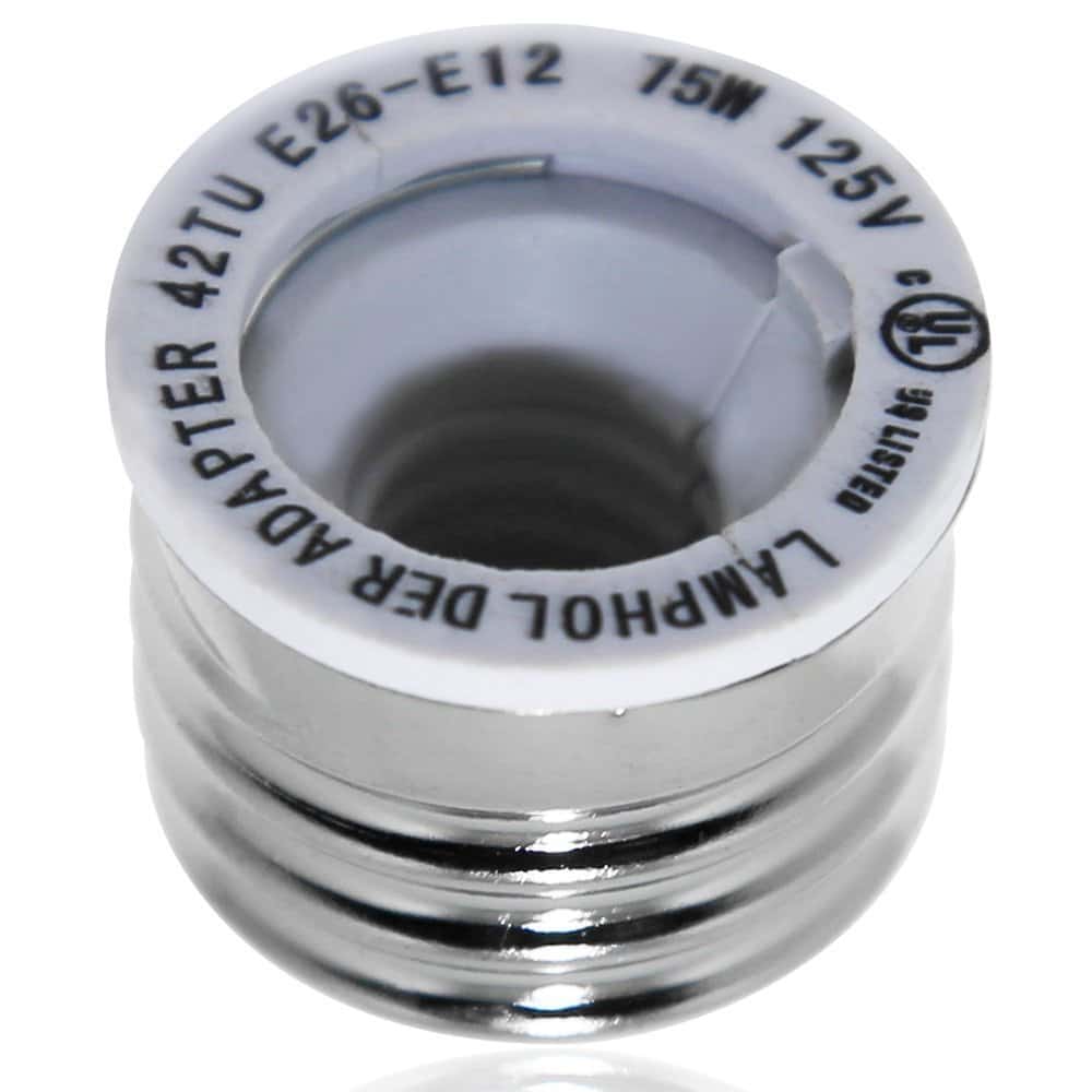 The UL Listed screw base adapter allows your E12 base bulb to a standard medium E26 bulb.Reference Max. Voltage / Wattage: 12-125V / 75WDimension: Dia28mm* H26mm / 1.1inch*1.02inch Material: Flame Retardant thermoplastic polymer(PBT) and cooper connectorPackage:.6 x E26-E12 Socket Adapter