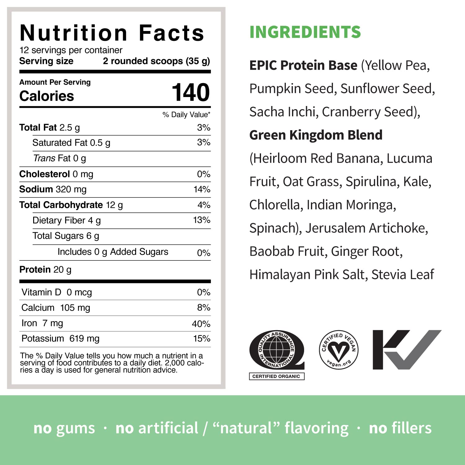 Epic Protein : Green Kingdom is a thoughtful blend of complete organic plant proteins and nutrient-dense, exotic superfoods. With 19 grams of the highest quality plant-based protein and bursts of sweet greens flavor and hints of citrus, it?s a smooth and delicious protein powder fit for your healthy lifestyle!