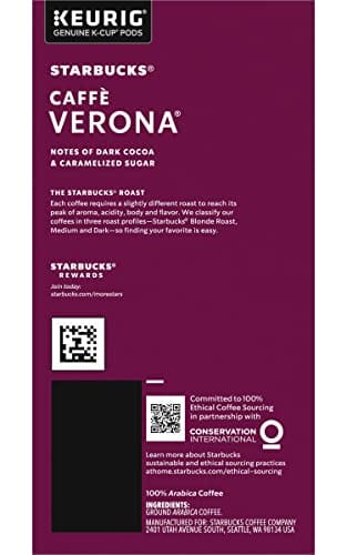 Starbucks Caffe Verona Coffee K-Cup Pods: Notes of dark cocoa & caramelized sugar. 100% Arabica coffee. The Story of Caffe Verona: Named after a city known for romance because it’s easy to fall in love at first sip. This multi-region blend has been winning hearts for decades. Originally created as a dessert coffee for a Seattle restaurant, it quickly became a hit in our stores. Well-balanced and rich with flavors of dark cocoa and caramelized sugar, it pairs perfectly with anything chocolate. Genuine K-Cup Pods: Only Genuine K-Cup Pods are optimally designed by Keurig for your Keurig coffee maker to deliver the perfect beverage in every cup. It’s easy to brew the perfect cup at home with your favorite Starbucks K-Cup pods. You’ll discover a variety of blends to fit your mood, the season or the tastes of gathered guests. Adding a touch of inspiration like milk, cream, syrup or a variety of other customizations lets you put a personal twist on your favorite Starbucks brew. Starbucks K-Cup pods make a perfect cup of coffee easy to enjoy?whether it’s a moment at the start of a new day, or as a reward at the end of a long one.