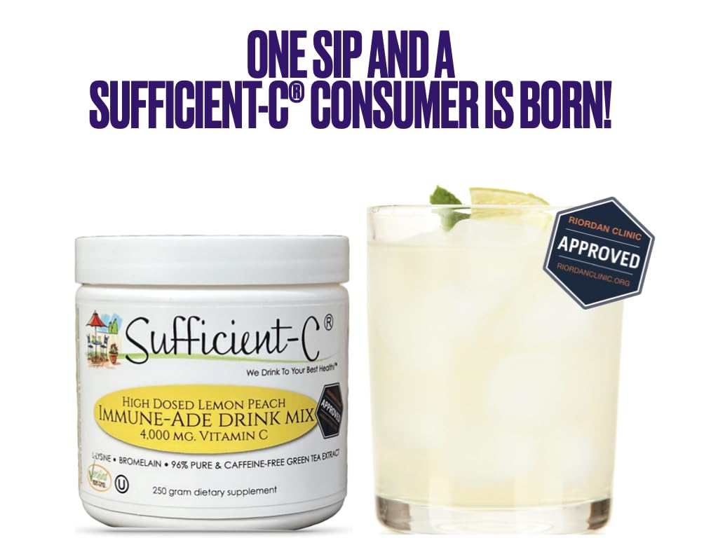 Sufficient-C offers a surprising, refreshing way to obtain the year-round, high dosed immune support you need and the sweet, satisfying flavor you crave! Vitamin C is the foundation of health and your immune system needs quite a lot of it. However ingesting the larger, consistently frequent, amounts of vitamin C in particular can be daunting, especially when you need immune support the most! Sufficient-C offers a refreshing combination of real plant based flavors with a premium blend of 4,000 mg. of non-GMO vitamin C ( 2,000 mg. per scoop ), L-lysine, Bromelain and a 98% pure green tea extract in a satisfying, thirst quenching drink mix! Nothing about Sufficient-C is hard to swallow! Now you can enjoy the unusual ease and benefits of a satisfying, immune strengthening beverage with meals and even for a work-out-recovery drink or simply just because! Sufficient-C is 100% water soluble so there are no particles floating about making it aesthetically pleasing as well! History and science have proven that higher dosing of vitamin C is what the immune system needs for the strength required to lower vulnerability to common ailments. Studies have proven that Vitamin C in the higher doses has an undisputed therapeutic effect. Since sugar impedes vitamin C absorption, no sugar or sugar derivative has been added to Sufficient-C. Rather an organic, premium grade of stevia has been used for a satisfying, compelling sweetness! Now you can kick back and enjoy the ease of healthy hydration rather than experience the daunting task of swallowing many pills and capsules. Flavor with function doesn?t get sweeter than this! We invite you to lean on Sufficient-C Lemon Peach Immune-ade drink mix for a healthy solution that doesn?t get sweeter than this!