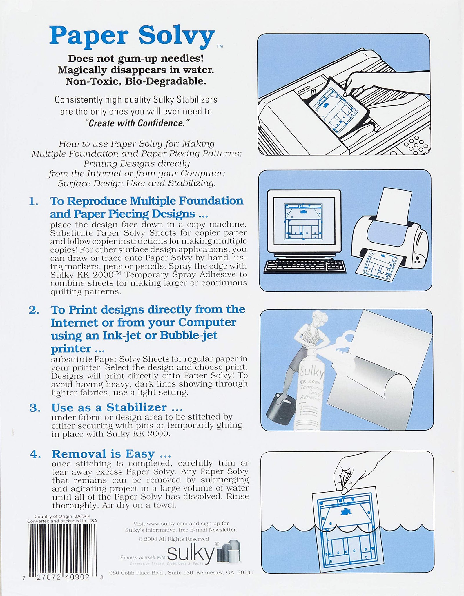 SULKY-Solvy Water Soluble Stabilizer is the ORIGINAL Lightweight Water Soluble Stabilizer. It is like magic. The perfect stabilizer and transfer agent that dissolves in water. Use as a design template as a pattern guide and a stitch support. ideal when you do not want any stabilizer to show on top or bottom. Great for monogramming computerized embroidery quilting buttonholes cut work hand-turned applique heirloom sewing and serging and much more. Size: 8.5×11 Inch. 12 pieces per package. Acid Free.