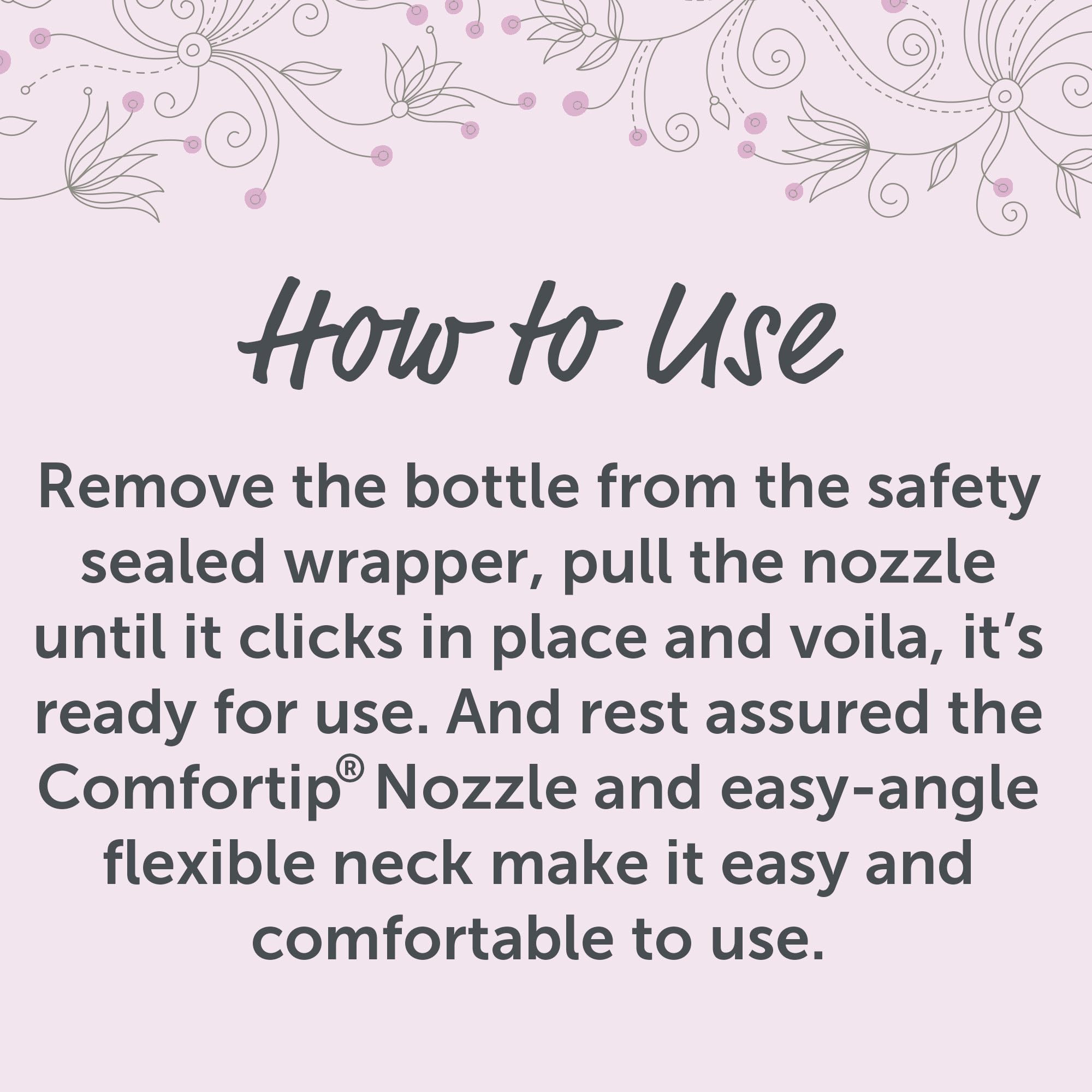 How Summer’s Eve is different: Exclusive One-Piece Unit: The bottle and nozzle are one single unit, so there’s nothing to assemble. Complete and ready-to-use. Comfortip? Nozzle: The Summer’s Eve douche nozzle has been designed to assure easy and comfortable insertion. Easy Angle Flexible Neck: The exclusive flexible neck allows you to adjust the nozzle to the most comfortable position for you. Exclusive Gentle Cleansing Formulas: Summer’s Eve douches have special gentle cleansing formulas with purified water to leave you fresh and clean. Safety Overwrap: Only Summer’s Eve units come completely overwrapped for sanitary protection prior to use.