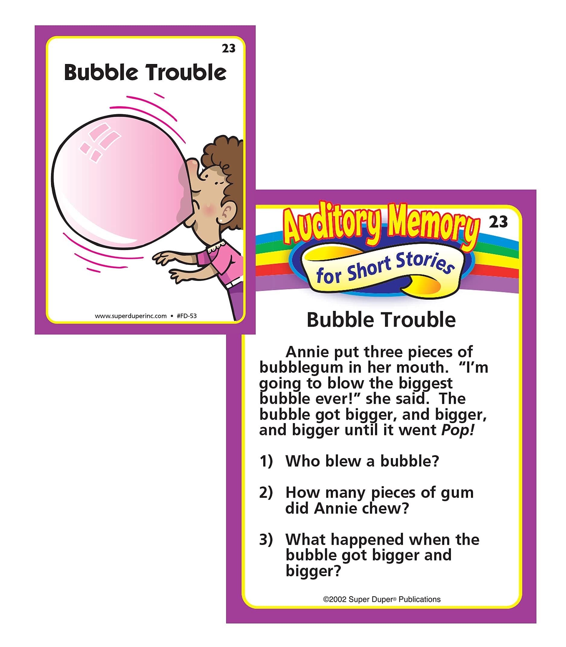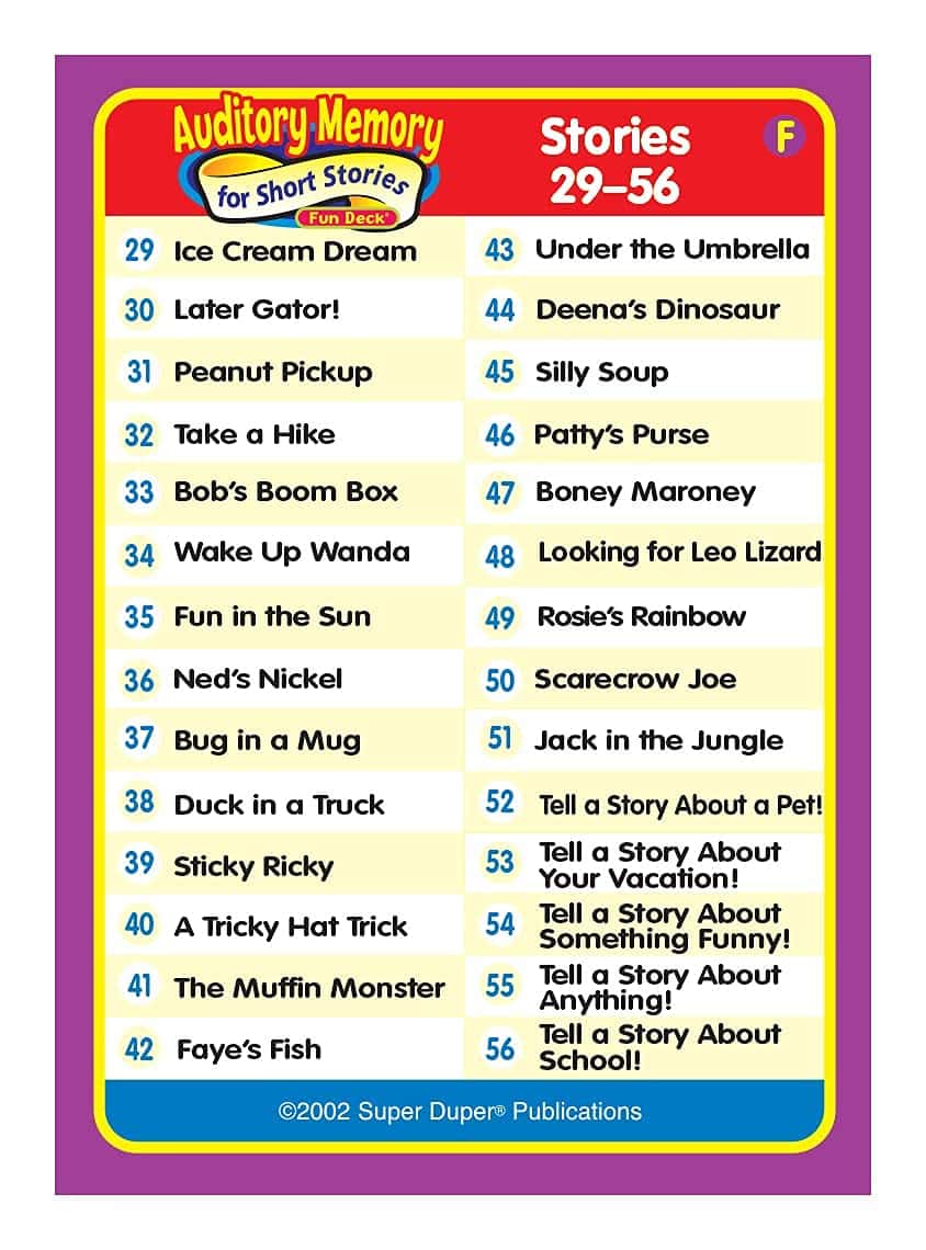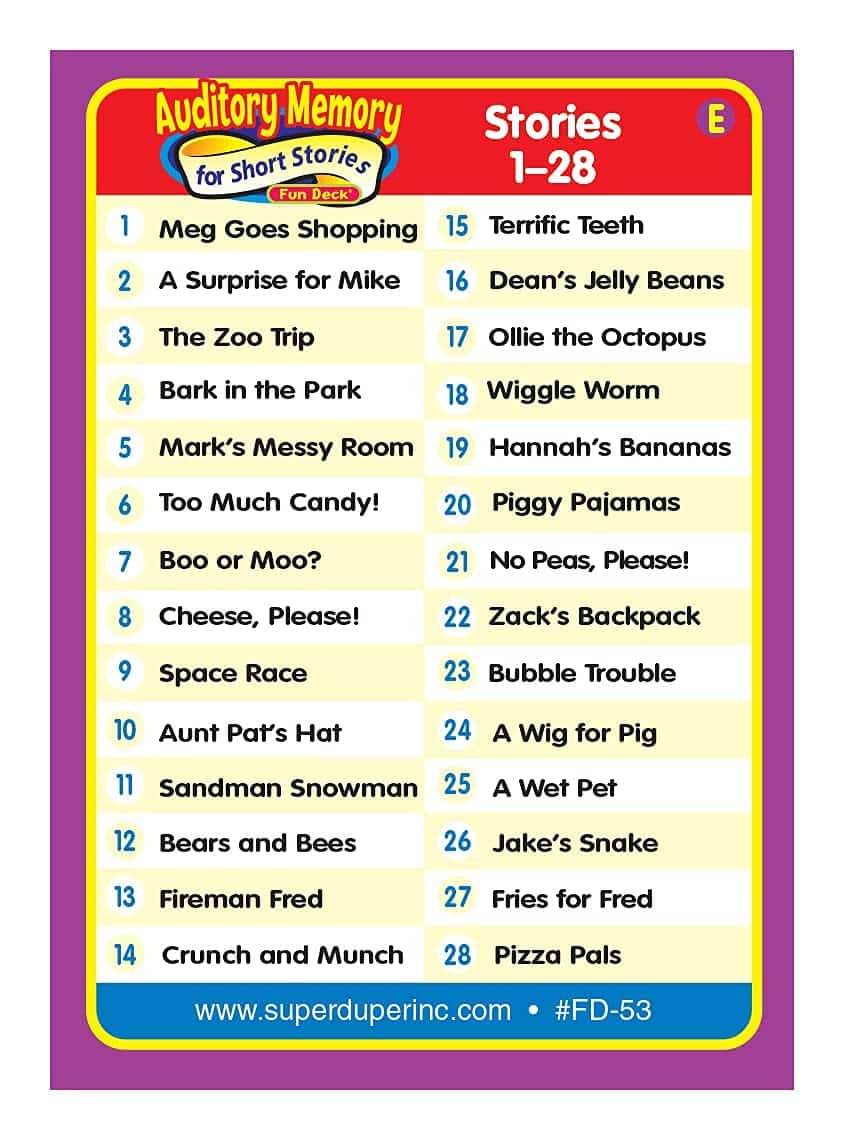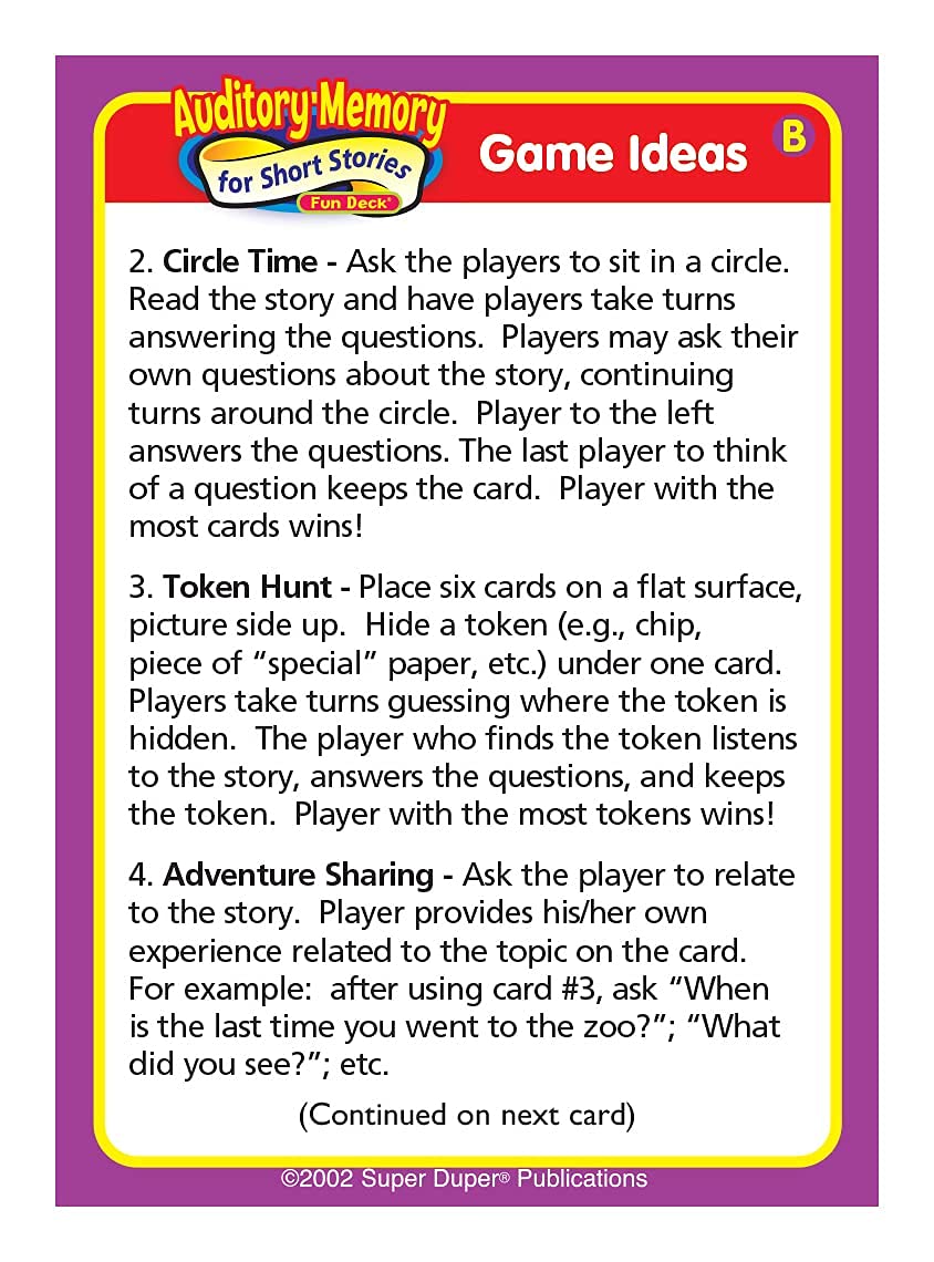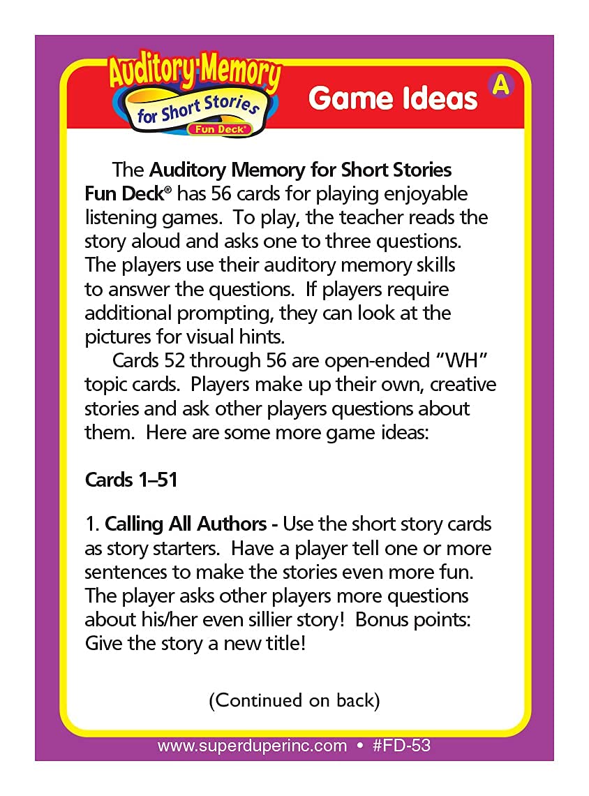 - You might also enjoy our “Auditory Memory for Details in Sentences” Fun Deck Cards – also available on Amazon