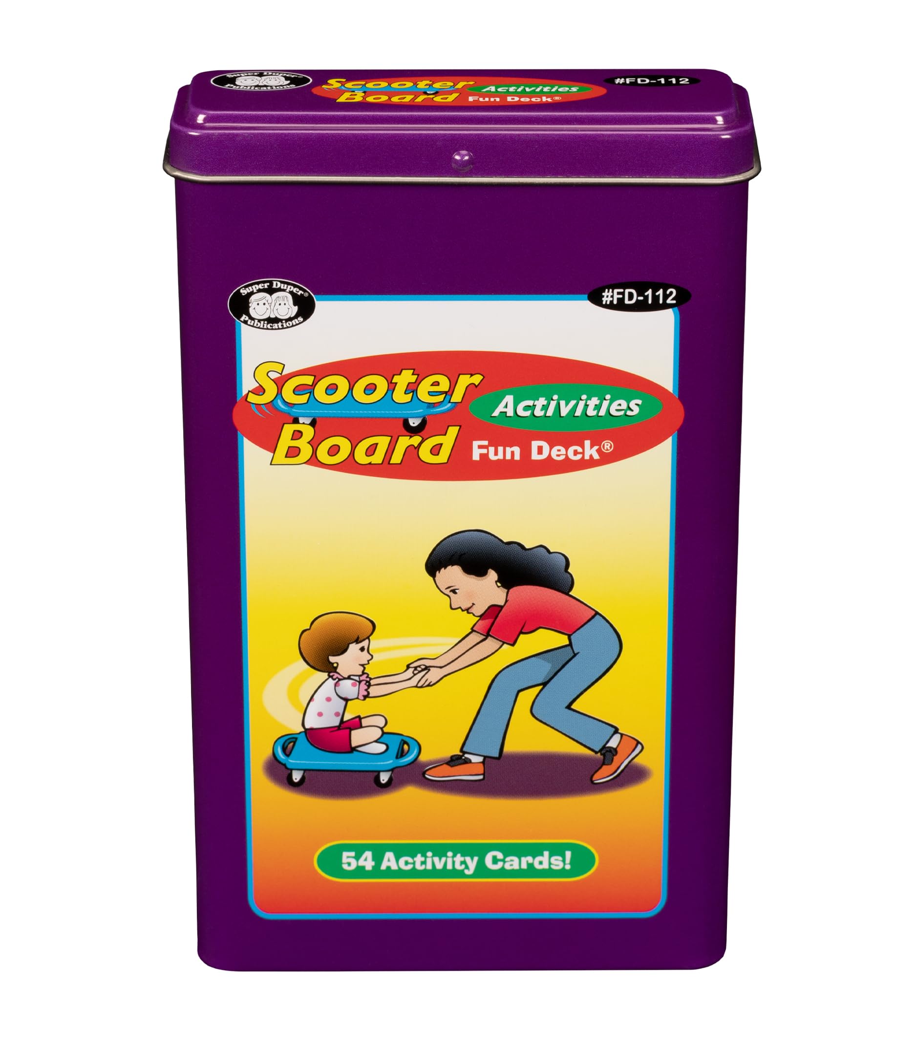 This Scooter Board Activities Fun Deck contains 54 fun and creative scooter board activities which address a wide range of therapy goals. Activities include upper body and core strength, motor planning, visual perceptual skills, fine motor skills, and sensory input. The deck contains 54 fully illustrated activity cards divided into three color-coded categories: Supine (Back) Activities, Prone (Tummy) Activities, and Sitting and Kneeling Activities. Each card front presents an illustration of the scooter board activity. The card back gives the therapeutic benefits, set up materials, directions, and other tips for using the scooter board. All in a sturdy storage tin. Cards are 3″ x 5″.
