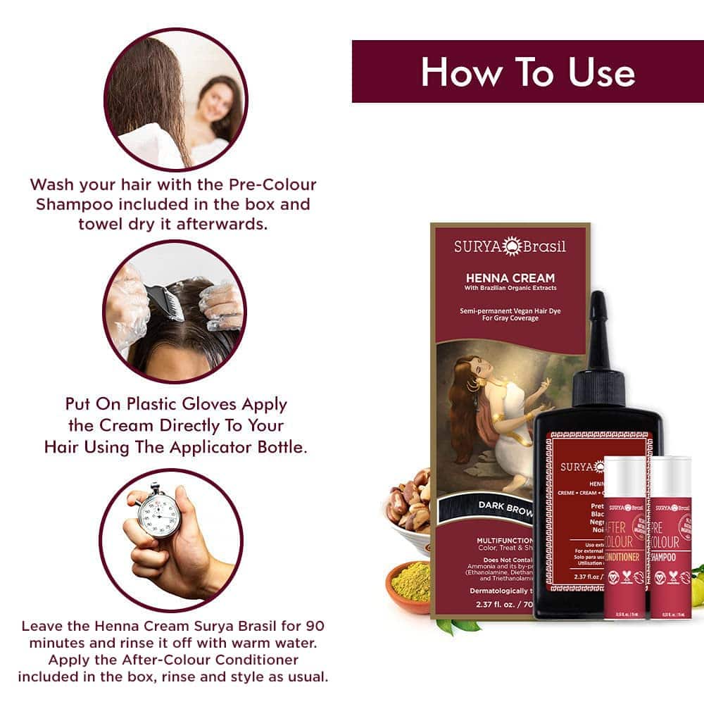 Surya Henna Cream colors while conditioning, moisturizing and revitalizing your hair. Our formula, enriched with vegetable extracts, nourishes hair for increased luster, softness and elasticity. The unique coloring process does not strip the melanin from the cortex of the hair, but rather forms a protective coat of rich semi-permanent color around each strand.Surya Henna Cream is a new concept in hair coloring and treatment; it won’t harm your hair or your health. Based in the principles of Ayurveda, Surya Henna Cream is formulated with a botanical complex of 15 herbs and fruits from India and Brazil’s Amazon rainforest. Hypoallergenic and dermatologically tested Natural Properties Henna: moisturizes and forms a protective layer on each hair strand.Arnica: functions as a capillary stimulant and as a vasoprotector.Guarana: a Brazilian fruit that functions as a capillary stimulant.Acai: a Brazilian fruit that moisturizes and acts as an emollient and remineralizer.Jua: a Brazilian fruit that is anti-inflammatory and stimulates circulation of the scalp.Aloe Vera: an emollient that moisturizes and softens.Brazil Nut: an emollient that moisturizes, revitalizes and conditions. Surya Henna Cream BenefitsGuaranteed to cover gray and white hair on the first application. Intensive treatment and shine from scalp to hair-ends. Safe for damaged and chemically treated hair including perms, body waves, relaxed, highlighted and color treated hair. Raw materials extracted with environmental responsibility, pursuing sustainable development.