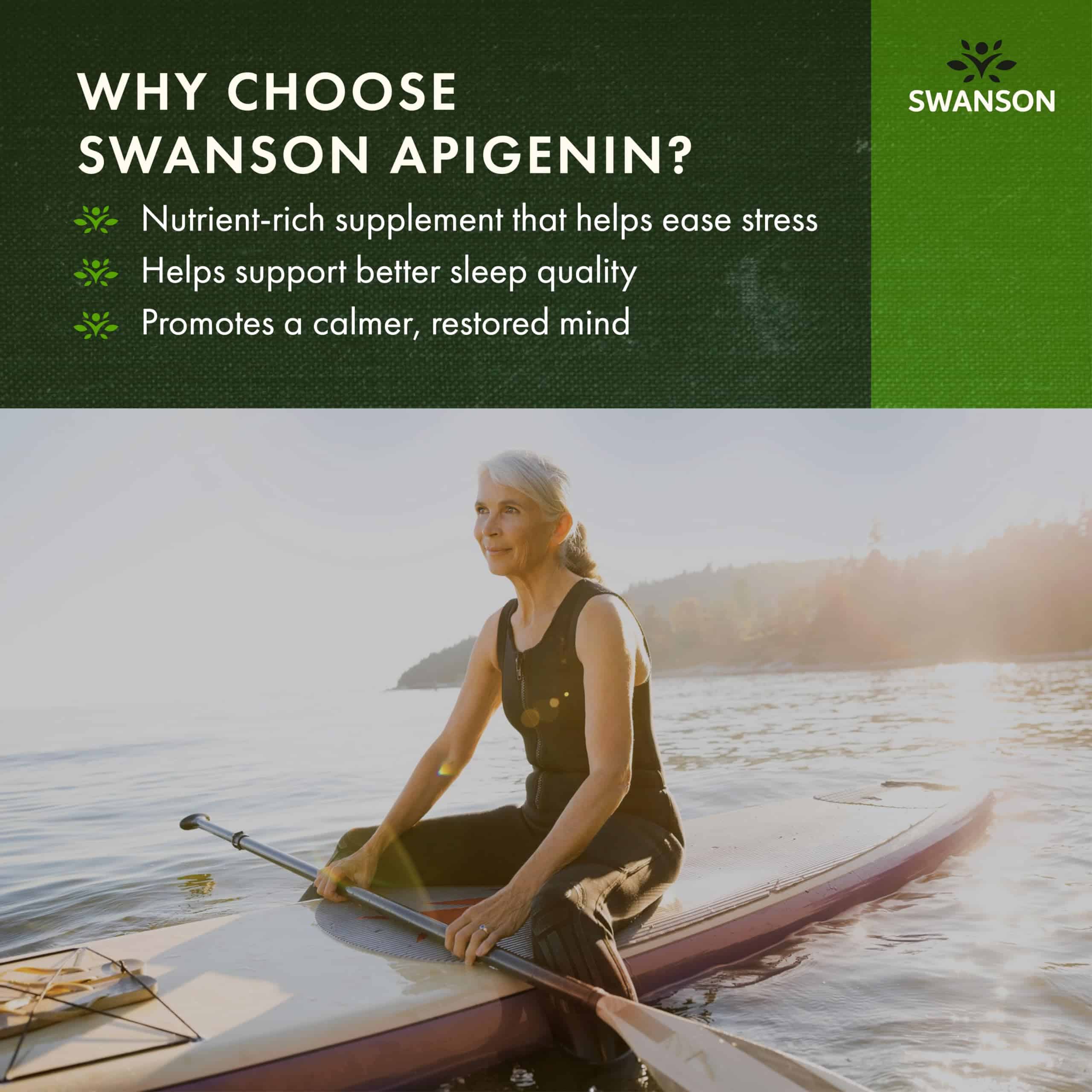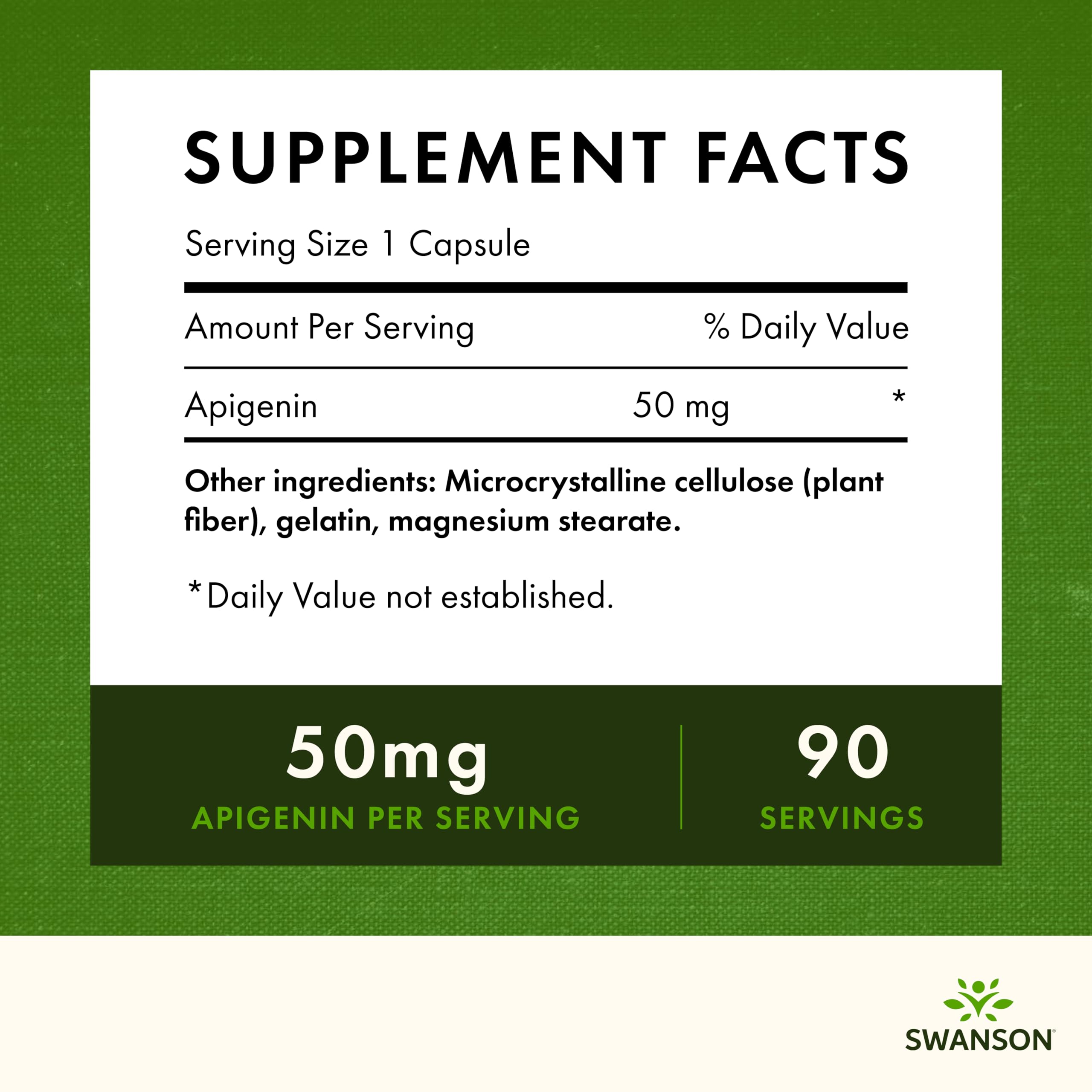 - CALMING SUPPORT: Swanson’s apigenin supplement aids a healthy stress response. Delivering 50mg apigenin per capsule, this powerful supplement may also provide antioxidant support.