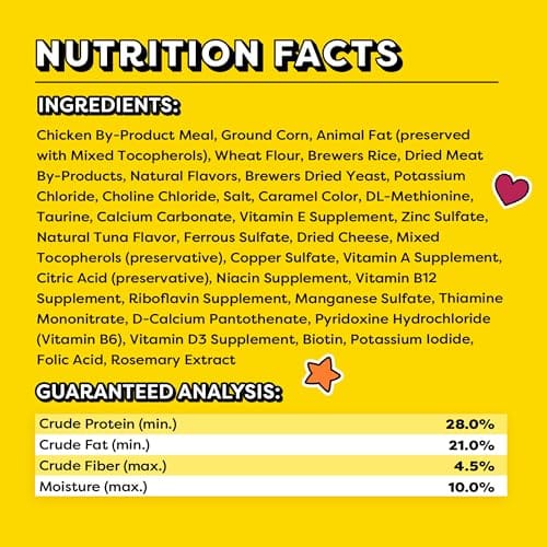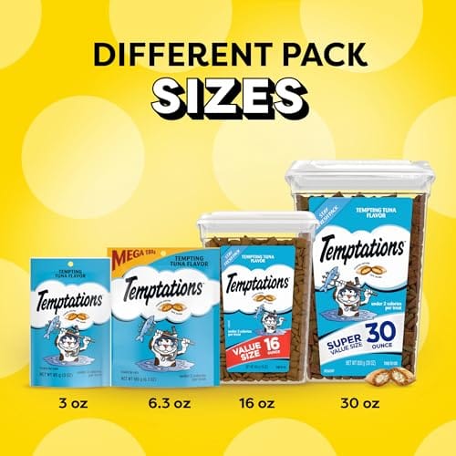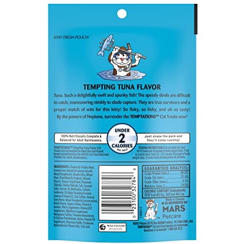Cats can?t resist the delectable taste of TEMPTATIONS, so give your cat these purrfect TEMPTATIONS Classic Cat Treats? they?ll come running the moment you open the tub. Each of these low calorie tuna flavor cat snacks has less than 2 calories and provides an irresistible combination of both crunchy and soft textures. These healthy cat treats also come in a cat-proof, stay-fresh pouch, so your feline friend can enjoy their favorite snack when you open it, but never when they shouldn?t! These TEMPTATIONS Classic Cat Treats are a perfect addition to your cat?s normal feeding routine: Use them as a treat, a meal, or a cat food topper. They also are the perfect size treats for cat toys… try mixing up playtime by placing a few inside a treat dispensing toy and watch your cat chase and swat away. * Based on 2020 Nielsen sales data