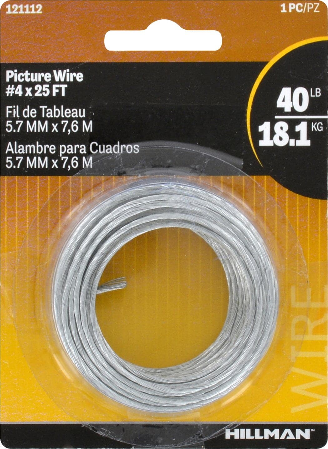 #4 Picture Hanging Wire – Braided 25 Foot. Supports up to 40 Lbs. Picture hanging wire. Braided wire for strength. Easy to install.
