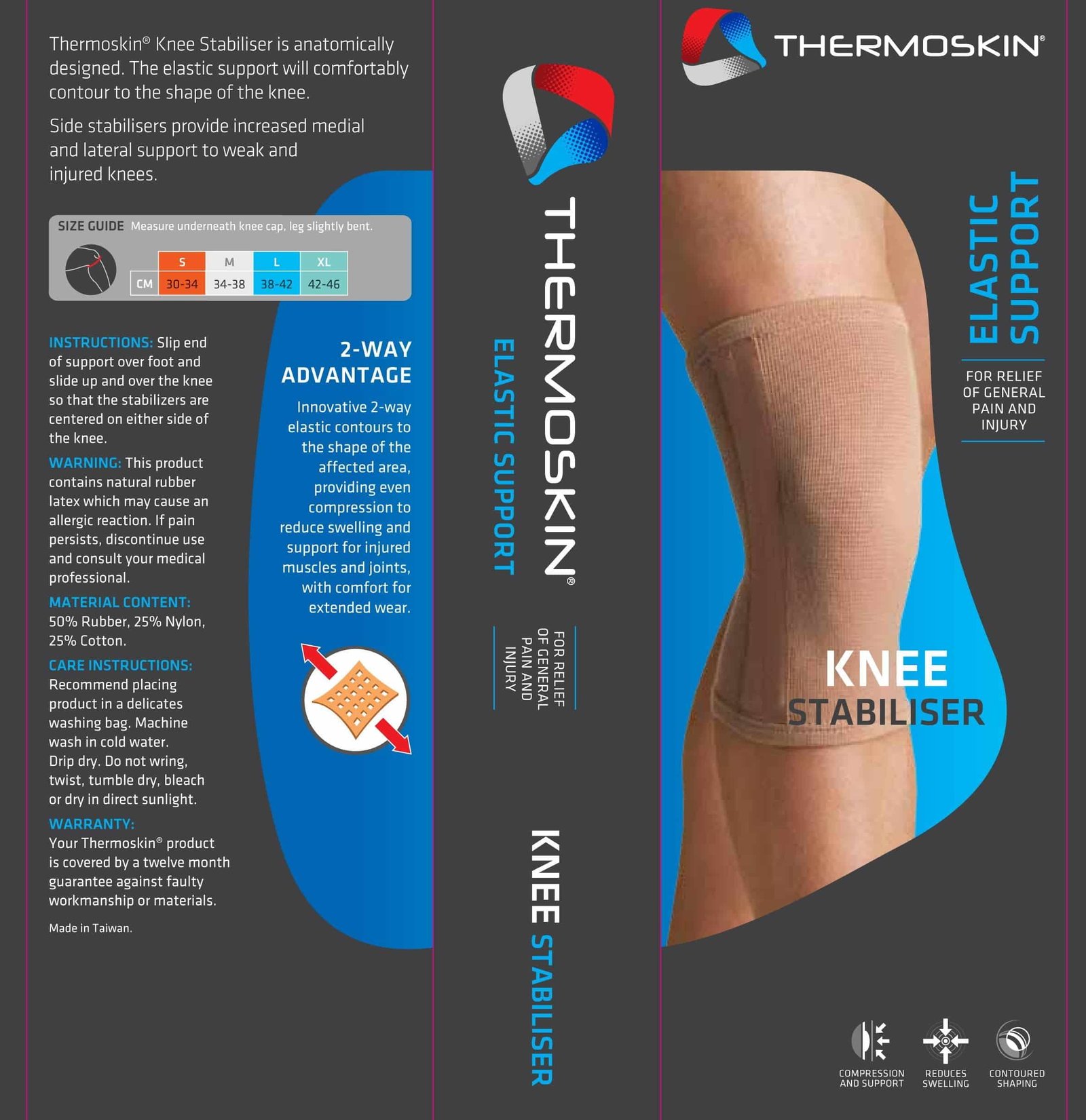 The Thermoskin Elastic Knee Stabilizer Support is anatomically designed for comfort and fit. It provides even compression and support for weak and injured knees, while minimizing bunching. The side stabilizers provide increased medial and lateral support to weak and injured knees. Knee Sizing Guide: Measure the circumference just below the knee cap. Small 12 – 13 1/2 inches. Medium 13 1/2 – 15. Large 15 – 16 1/2. X-Large 16 1/2 – 18 inches. If in doubt on Thermoskin sizing it is generally best to select the larger size.