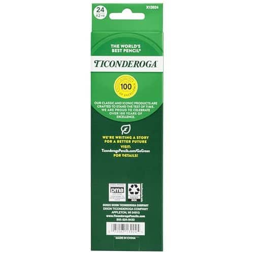 Ticonderoga has a tradition of fine quality writing instruments in the US for over 100 years. The exclusive graphite core features a proprietary formula focusing on graphite mined from carefully controlled sources to deliver extra smooth performance. Top-quality latex-free erasers remove marks completely without smudging. Premium wood harvested from responsibly managed sources provides smooth, even sharpening with minimal breakage. Teachers prefer Ticonderoga for its dependability and craftsmanship. When only the best will do, choose Ticonderoga brand pencils.