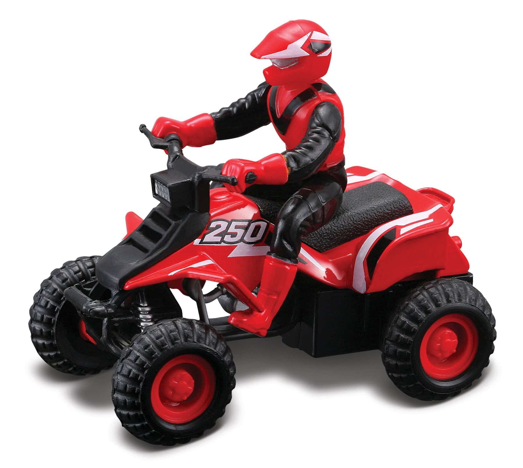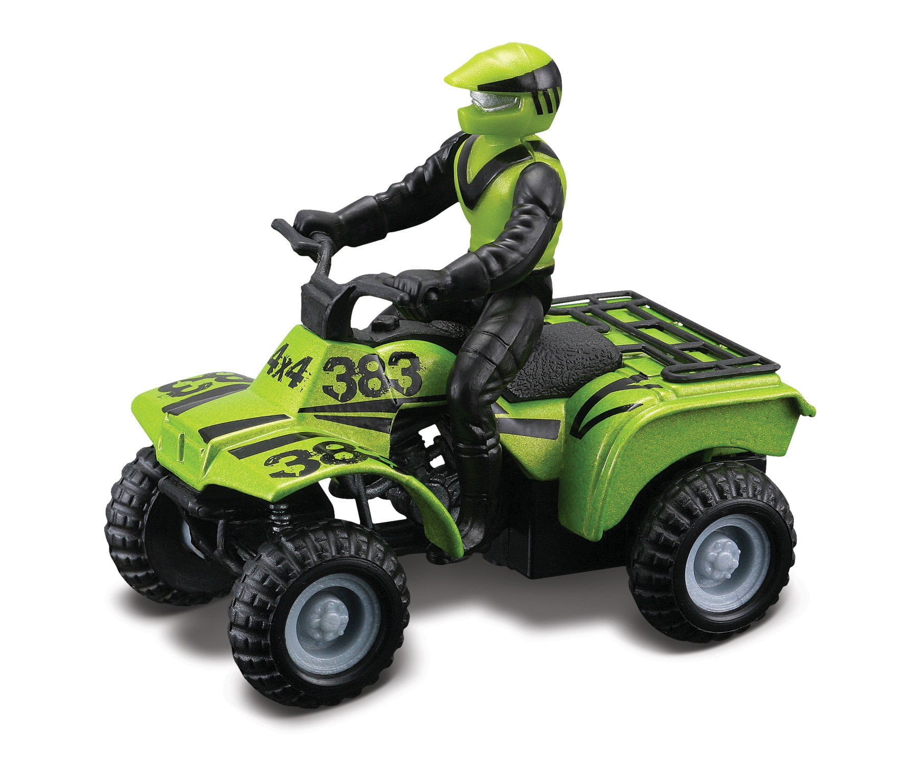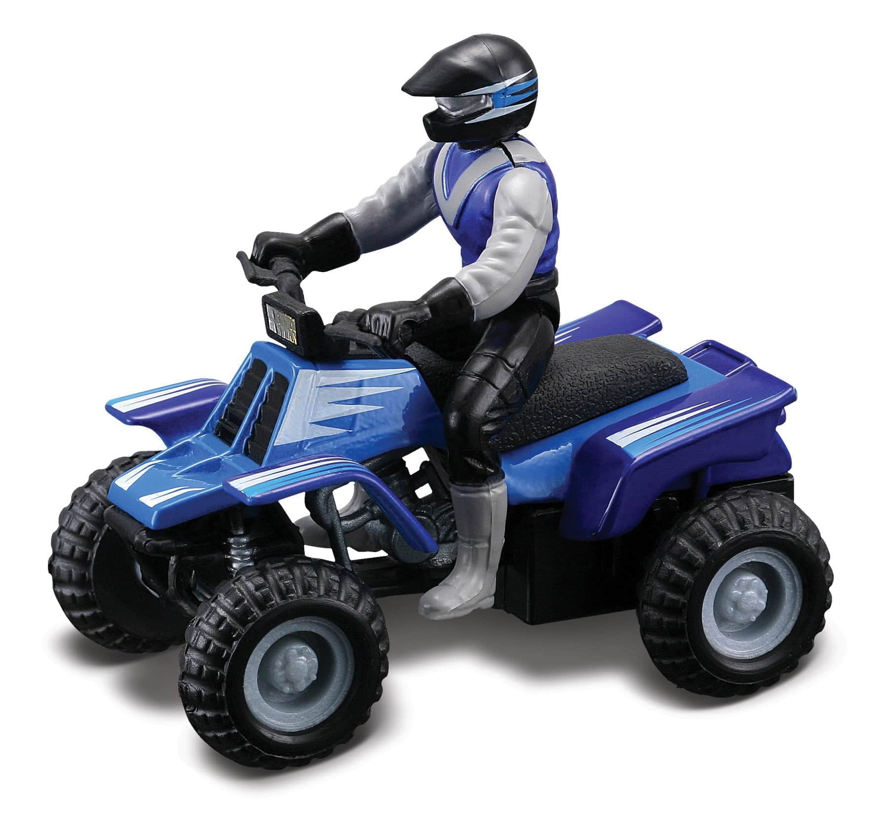 Diecast all-terrain vehicle with pull-back motor and movable stunt rider. This quad bike toy features soft paddle-style tires, just like those found on off-road vehicles to help them on softer ground, such as mud and sand.