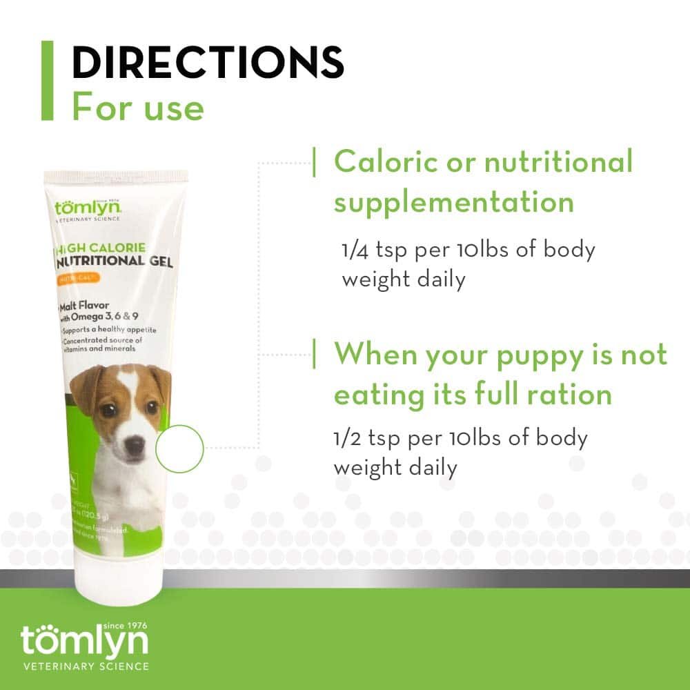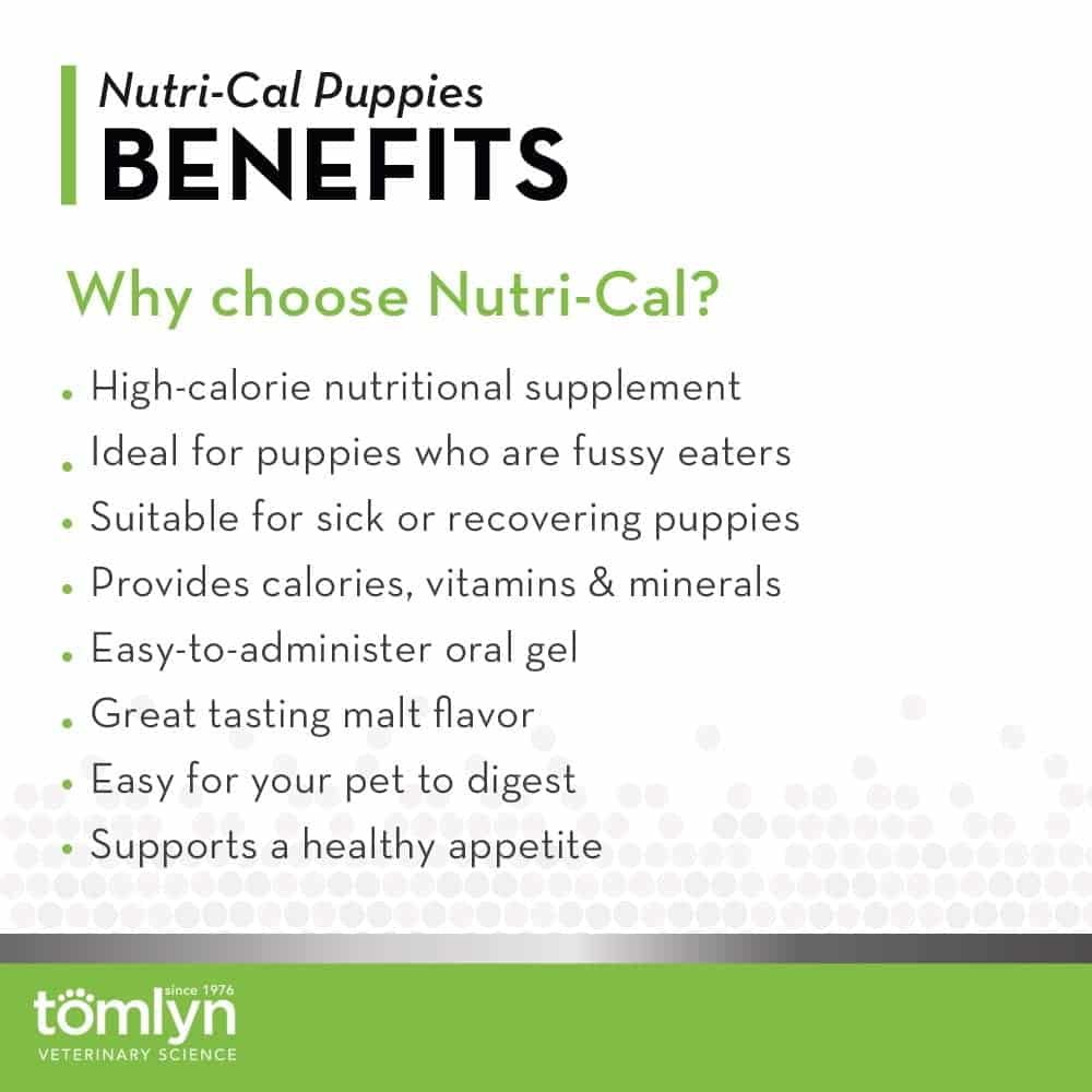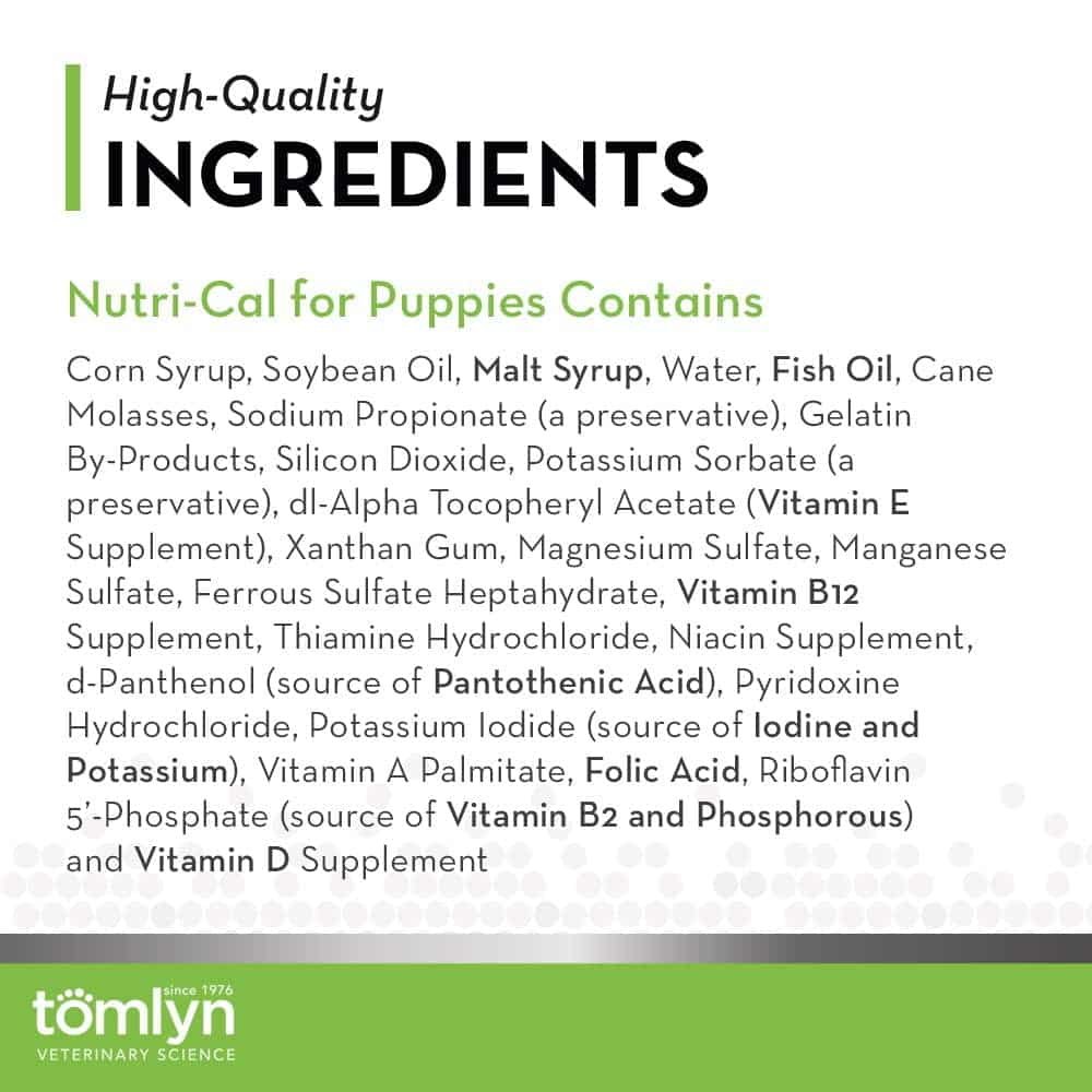 - Nutri-Cal high-calorie gel; concentrated source of vitamins and minerals, ideal for growing puppies