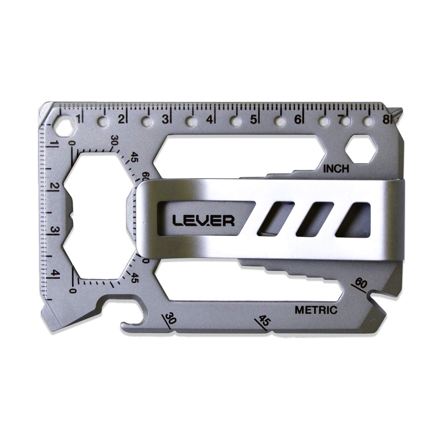 The Lever Gear tool card pro packs 40 functions into a beautifully crafted, credit card-sized multi tool. Pop bottles, open cans and boxes, turn screws, nuts and bolts, measure in millimeters or inches, cut cords, and more. It s effortless to carry and TSA compliant so it s always with you so you can get things done. Each tool card pro comes with a removable money clip that holds up to six cards or a wad of cash. The clip snaps on or off in seconds without fasteners so you can slip the card in your wallet, or just carry a minimalist money clip. The tool card is built for people who demand quality tools and like to be prepared to handle everyday tasks as they arise. It s made in America from heat-treated 420 stainless steel, has a beautiful satin finish, and is laser marked for dark, permanent graphics. With a unique blend of style and function, the tool card pro is the perfect gift for gear lovers, designers, makers, hikers, homeowners, and anyone who likes cool tools.