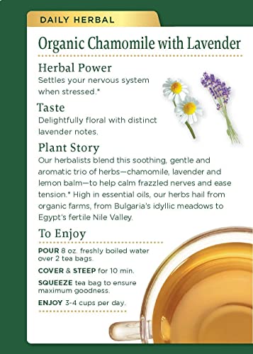 Herbal Power: Settles your nervous system when stressed.* Taste: Delightfully floral with distinct lavender notes. Plant Story: Our herbalists blend this soothing, gentle and aromatic trio of herbs?chamomile, lavender and lemon balm?to help calm frazzled nerves and ease tension.* High in essential oils, our herbs hail from organic farms, from Bulgaria?s idyllic meadows to Egypt?s fertile Nile Valley.