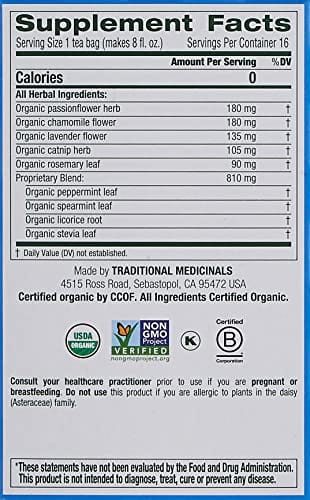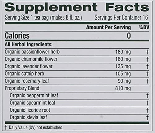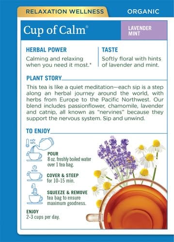 Herbal Power: Calming and relaxing when you need it most.* Taste: Softly floral with hints of lavender and mint. Plant Story: This tea is like a quiet meditation?each sip is a step along an herbal journey around the world, with herbs from Europe to the Pacific Northwest. Our blend includes passionflower, chamomile, lavender and catnip, all known as ?nerviness? because they support the nervous system. Sip and unwind.