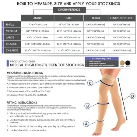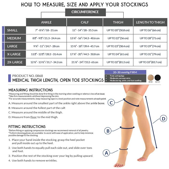 Truform 0868 was created to help relieve conditions associated with poor circulation. Graduated compression technology delivers a compressive action to the leg that is greatest at the ankle, then gradually decreases toward the heart. The 20-30 mmHg Firm compression level is great for post surgery and severe edema, varicose veins, hypotension, post thrombotic syndrome (PTS), post sclerotherapy, and more. Truform therapeutic medical stockings feature classic styling and a smooth knit fabric that helps conceal unsightly conditions. The open toe feature allows for easy toe inspection and permits one standard size to fit a variety of foot dimensions. Color options are basic neutrals for all-occasion wear. Truform stockings, socks and pantyhose feature Graduated Compression Technology, which delivers a compressive action to the leg that is greatest at the ankle, then gradually decreases toward the heart. Graduated compression provides two primary benefits: it helps treat and lessen swelling for the wearer, and the compression action help to prevent the slowing of blood flow so it can flow more quickly up the leg back toward the heart. Truform graduated compression support hosiery helps maintain positive circulation and leg health. We take the extra time and effort necessary to insure a therapeutically effective, comfortable fit. The combination of state-of-the-art materials and equipment, plus knitting know-how sets Truform apart from the crowd to make your legs look and feel great.