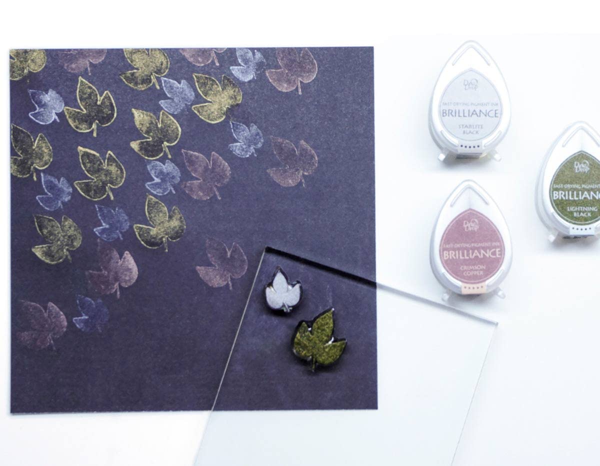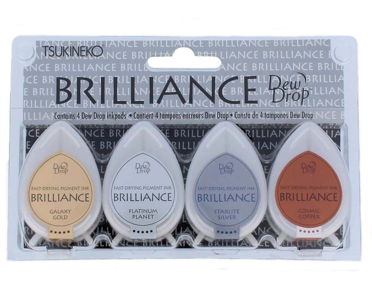 Tsukineko’s Brilliance is a pigment ink that leaves a shimmery or matte (depending on the color) finish and dries naturally on vellum. Brilliance is ideal for stamping, stenciling and crafting applications such as cards, journals, scrapbooks, and more. Brilliance Dew Drop 4-pack are available in seven color sets. Use on paper, vellum, shrink plastic, polymer clay, wood and leather. Also available in full-size inkpads and Inkers.