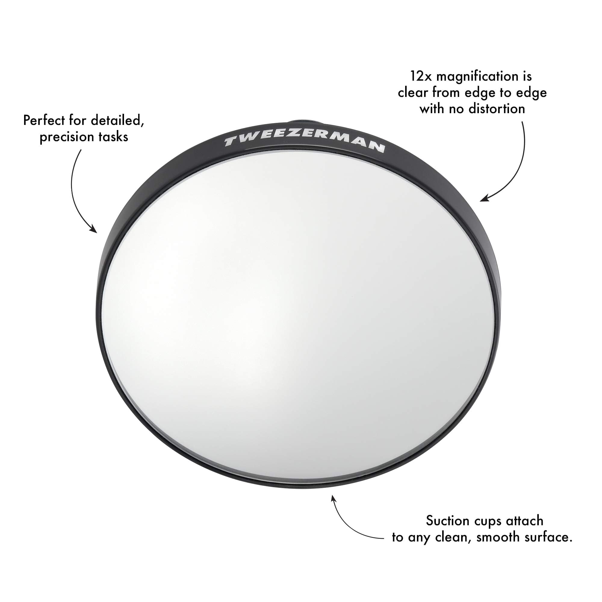 12x magnification is clear from edge to edge with no distortion. Perfect for tweezing, contact lens and makeup application. Attaches to any clean, smooth surface. Do not use in direct sunlight. Wipe clean as needed.