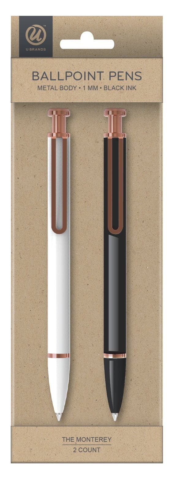 Meet our best-selling pen, The Monterey. Cross off to-dos confidently with this set of two retractable ballpoint pens, featuring smooth black ink. The metal barrel provides a weighted sensation as it effortlessly glides across the page. The Monterey’s sleek appearance, finished with rose gold metal accents, along with its high-quality components, strikes the perfect balance between design and functionality. It is equipped with a medium tip (1 mm), durable metal hardware, and our signature U-Clip, making it easy to carry in a pocket or attach to a notebook. Perfect for confident, impactful writing during your daily note-taking sessions. Explore our stylish and fashion-forward product lines, including stationery, journals, writing tools, presentation boards, and desk organization solutions for your home, school, or office.