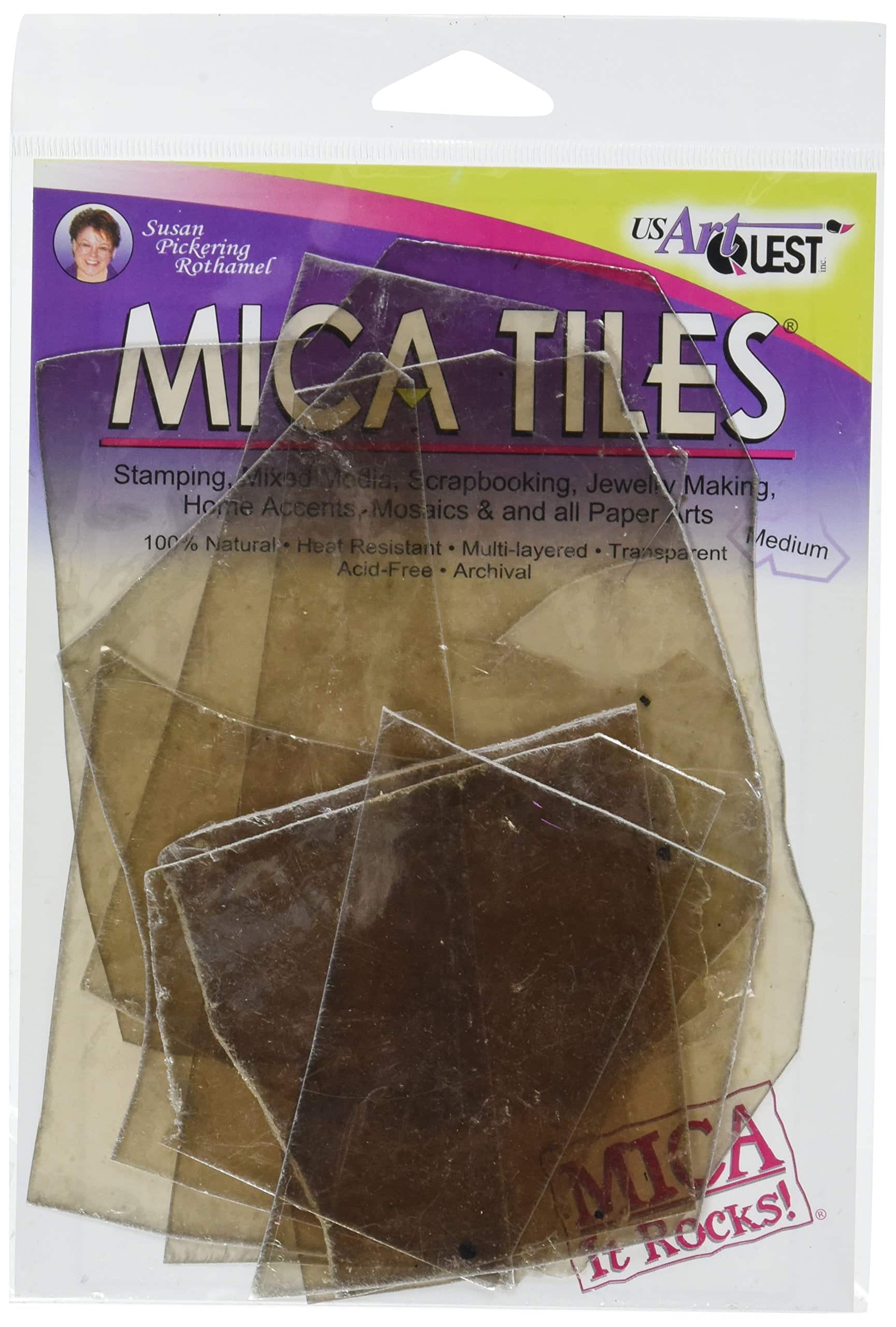 US ART QUEST-Mica Tiles are 100% natural heat resistant multi-layered transparent acid-free and archival safe. Each tile has their own distinctive variations and markings are remarkably versatile creative elements adds organic character and color and Texture to every project! Can be used for stamping scrapbooking cards ornaments collage jewelry making photo transfers altered art and much more! Simply tear cut with scissors or diecut then adhere them to virtually any surface. Size: 5 by 6. approximate size: 1 oz.