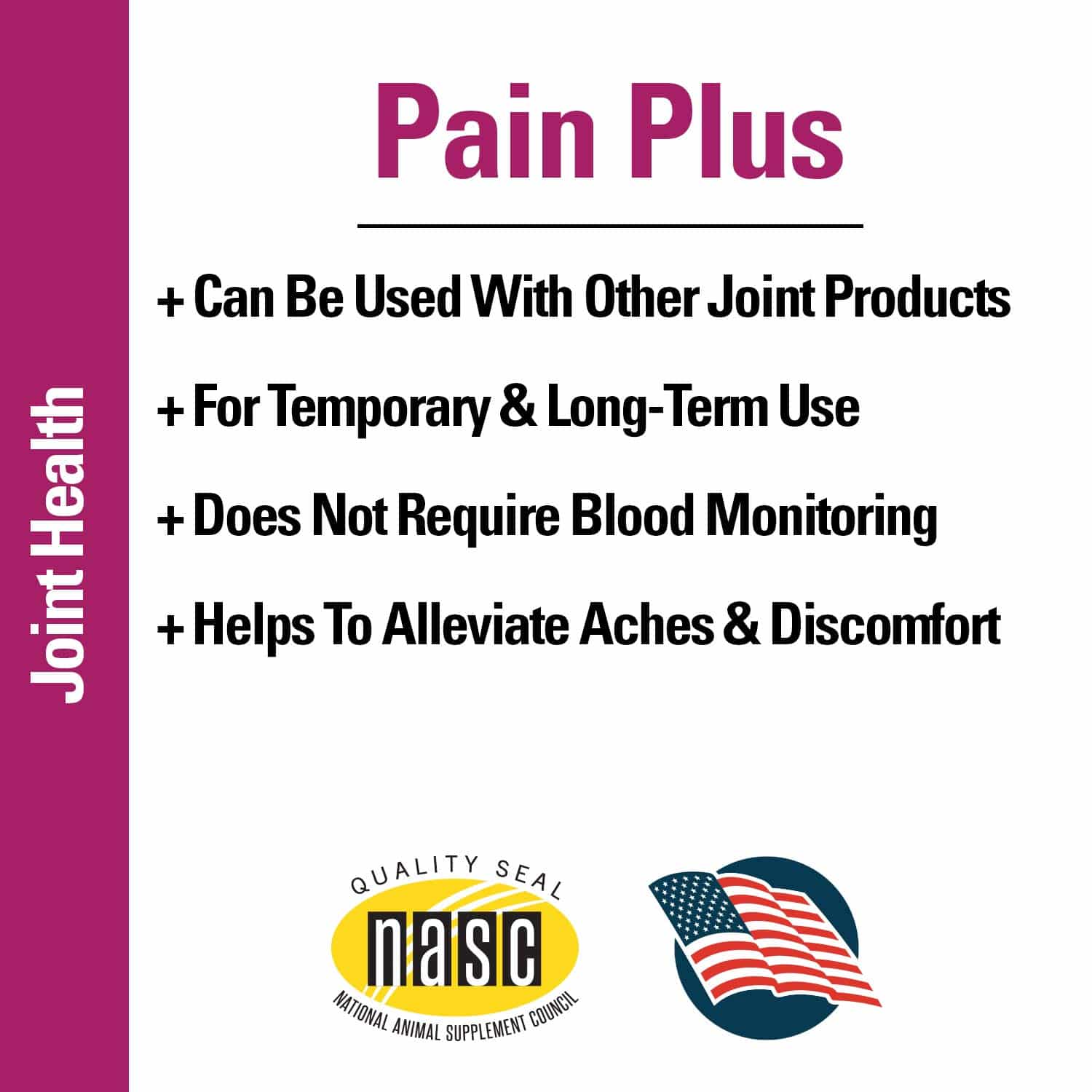 - ENCOURAGE ACTIVITY, MINIMIZE DISCOMFORT FOR DOGS: Pain Plus can be used prior to, and in conjunction with, other joint products and is recommended for temporary or long term use.