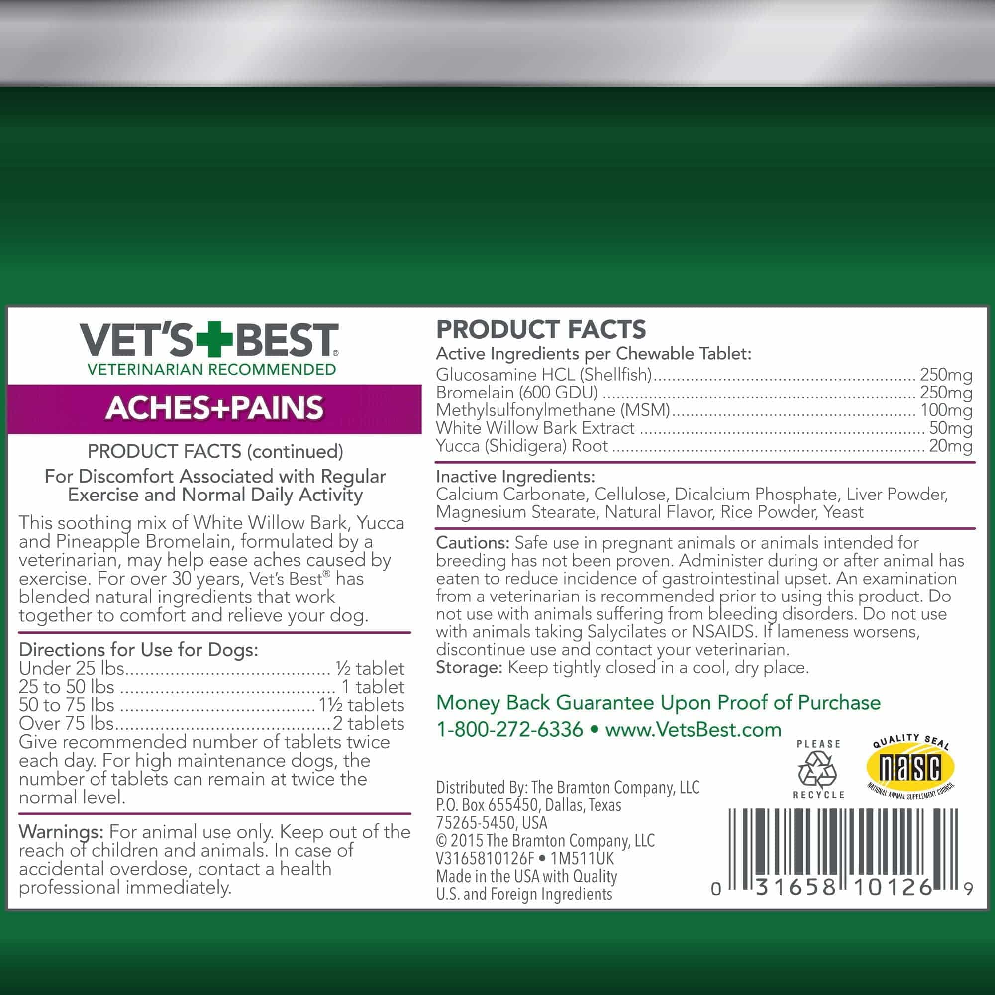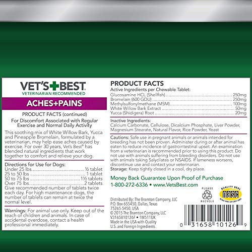 - KEEP MOVING – Vet?s Best Aches & Pains Dog Supplements helps relieve occasional discomfort caused by regular exercise and normal daily activity.