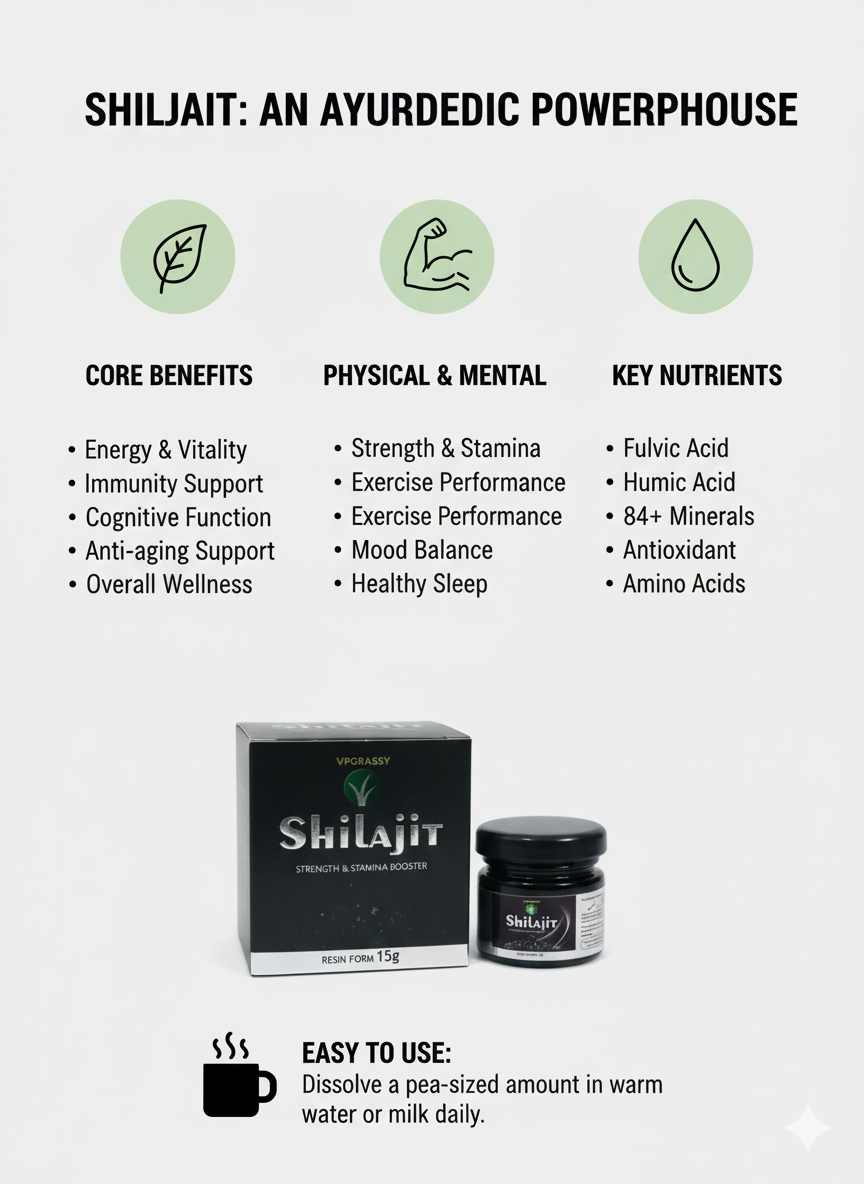 VP Grassy Shilajit Resin is carefully purified using traditional methods to ensure maximum purity and effectiveness. It dissolves easily in warm water or milk and is ideal for individuals looking to naturally enhance their energy, stamina, immunity, and daily wellness.