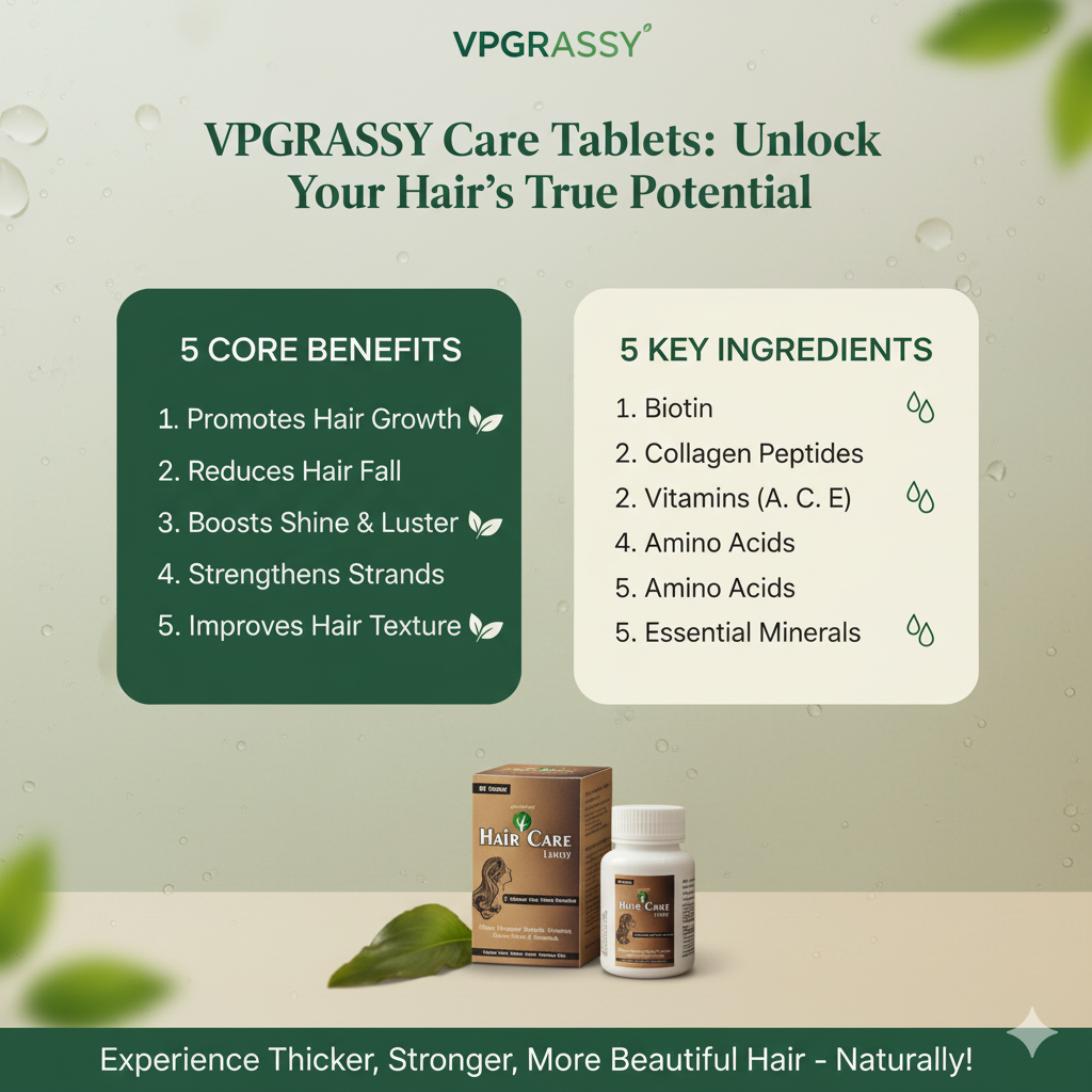 Suitable for both men and women, VP Grassy Hair Care Tablets offer a safe and effective way to nourish your hair internally and restore natural strength. Ideal for individuals dealing with hair fall, thinning hair, weak roots, or poor scalp health.