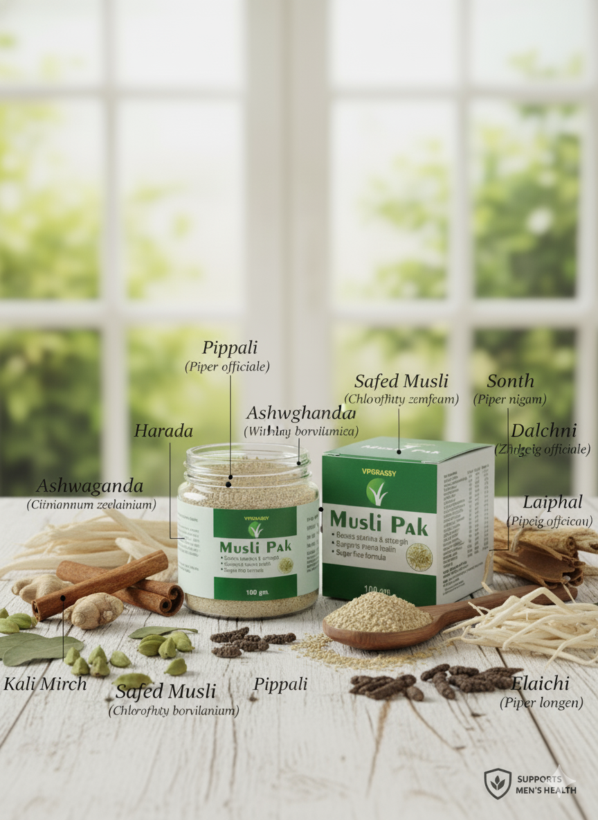 Safe for long-term consumption, VP Grassy Musli Pak is ideal for individuals experiencing weakness, low stamina, or decreased energy due to lifestyle stress, workload, or general fatigue. Made using authentic Ayurvedic methods, it delivers purity, potency, and reliable results.