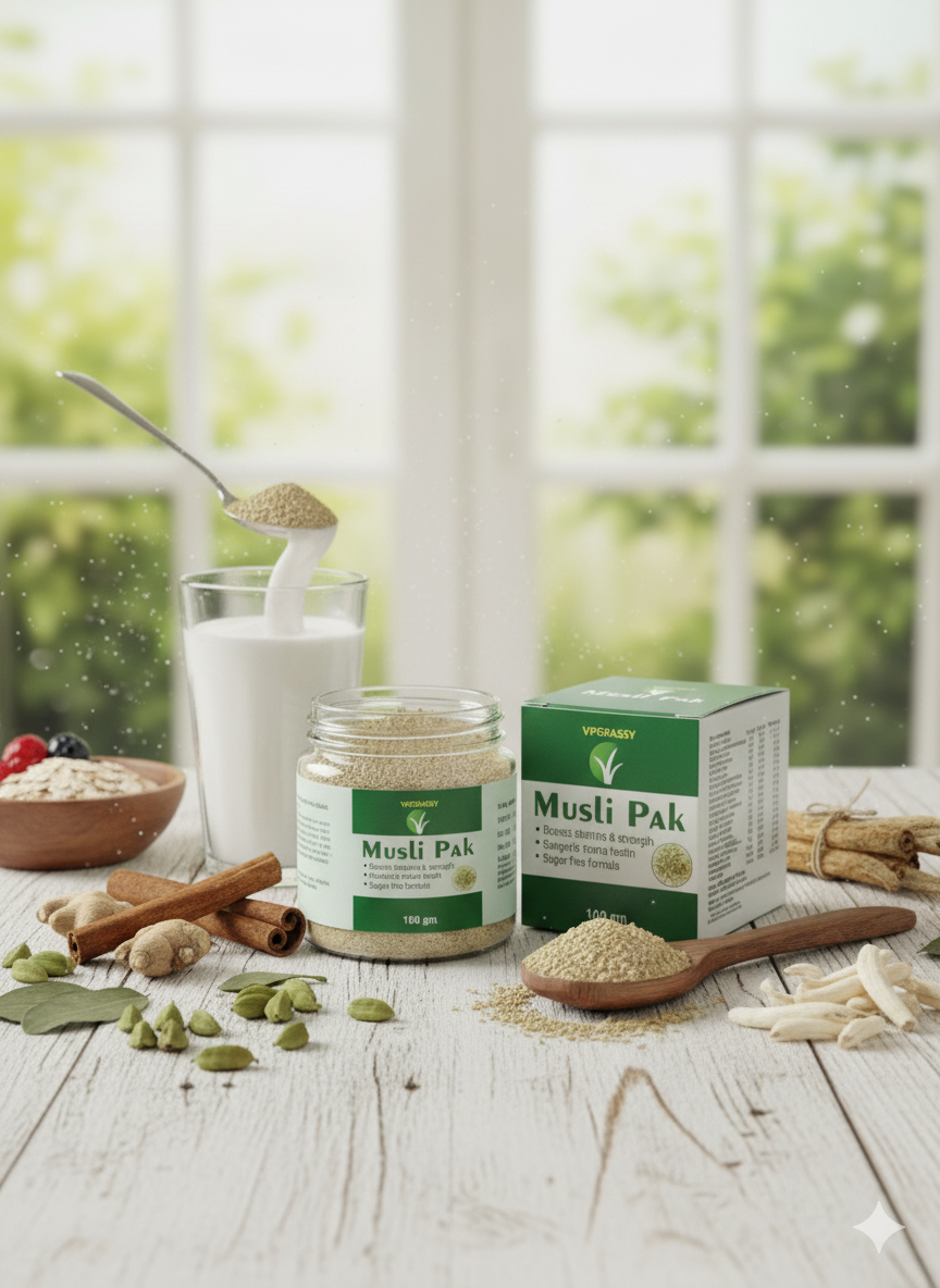 VP Grassy Musli Pak 100gm is a traditional Ayurvedic formulation enriched with Safed Musli and other natural ingredients known for improving strength, stamina, and overall vitality. It helps energize the body, reduce fatigue, and enhance physical performance by naturally nourishing the tissues and muscles.